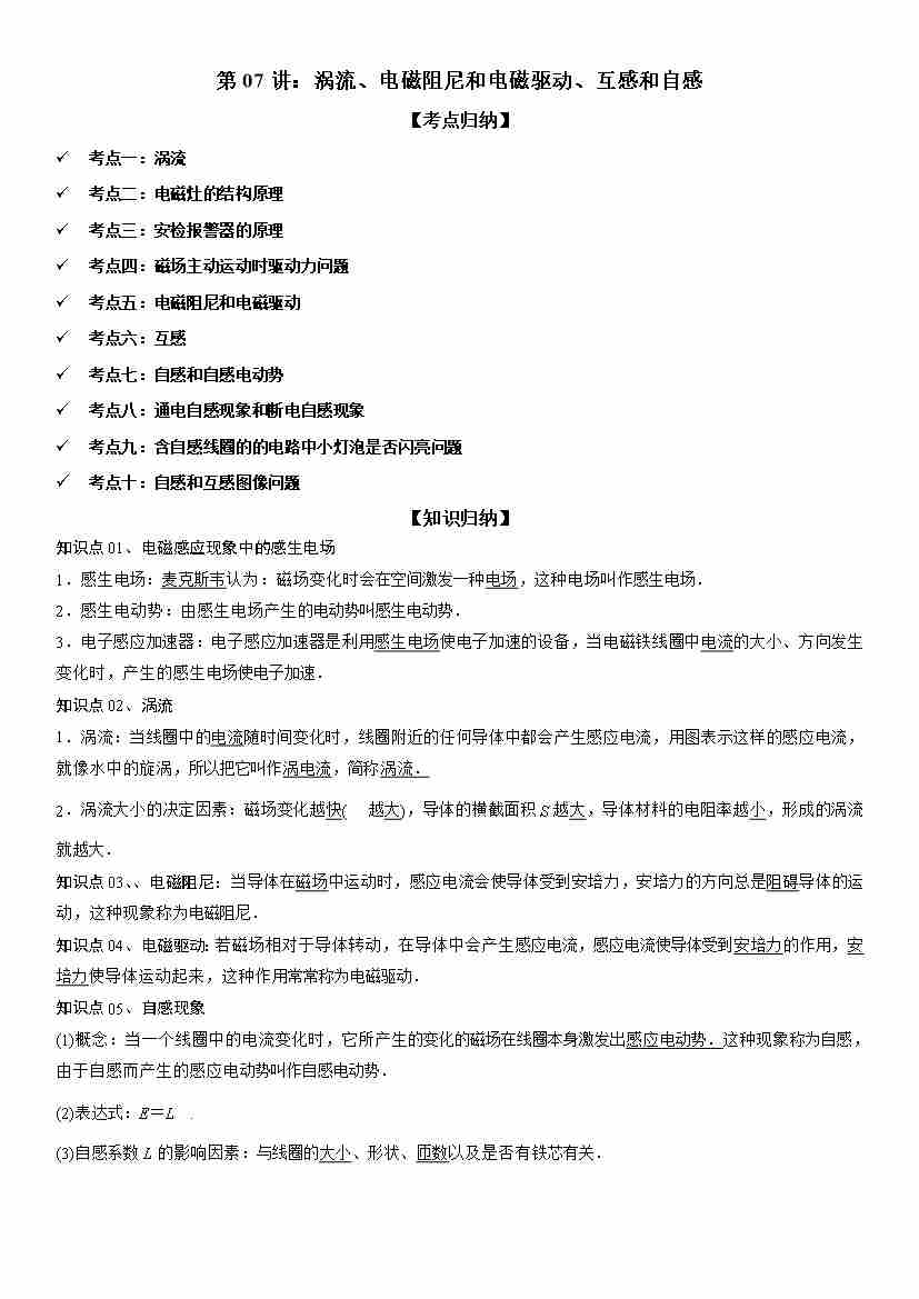 第07讲:涡流、电磁阻尼和电磁驱动、互感和自感 学生版
