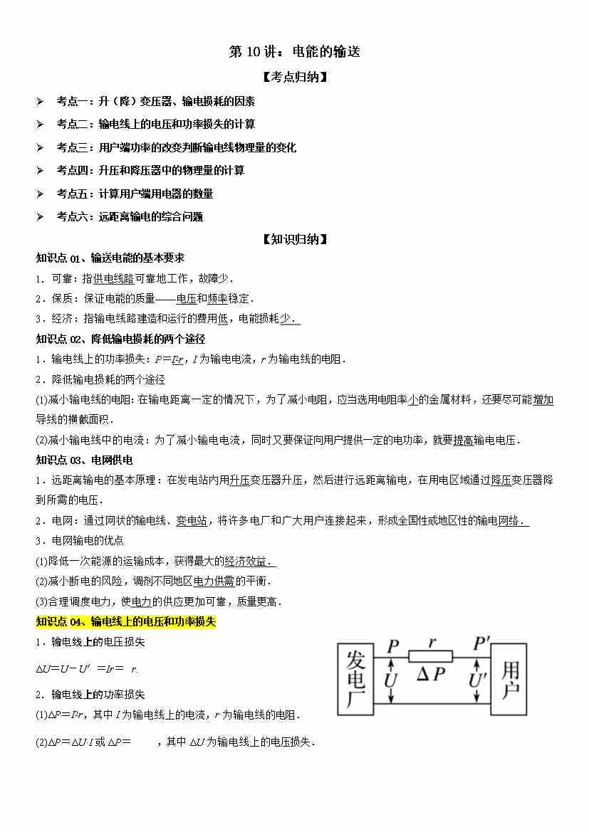 第10讲:电能的输送 学生版