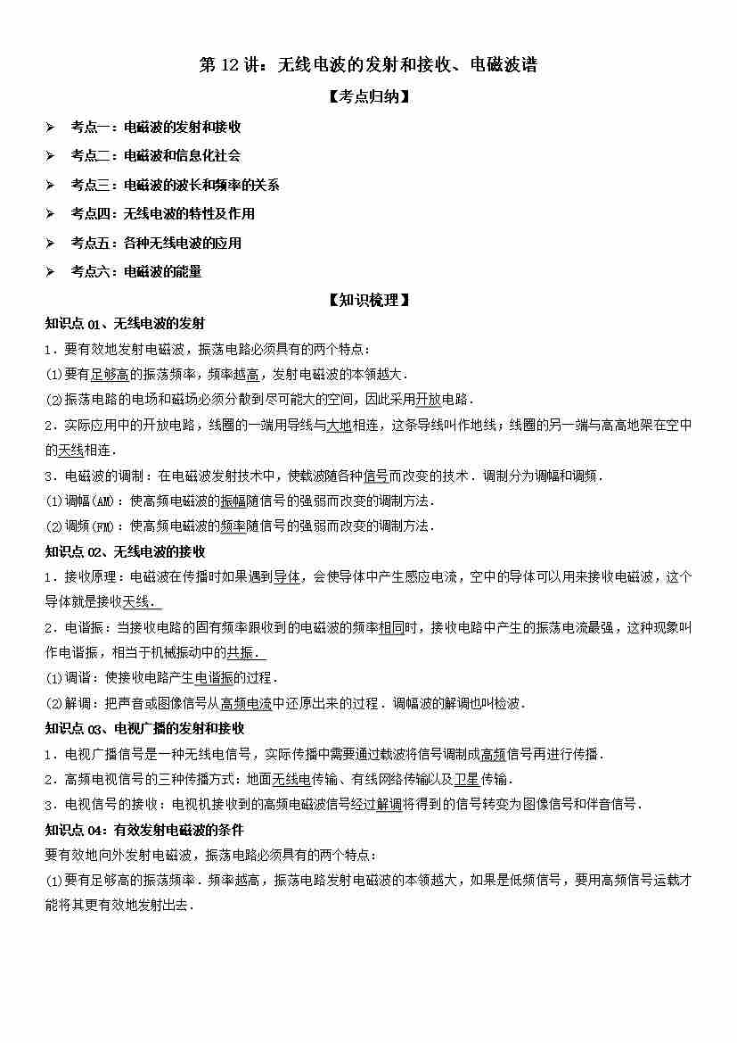 第12讲:无线电波的发射和接收、电磁波谱 学生版