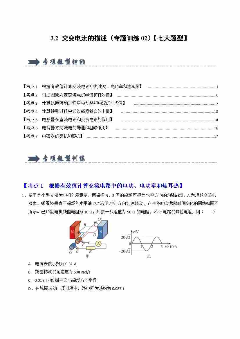 3.2 交变电流的描述(专题训练02)(七大题型)(学生版)
