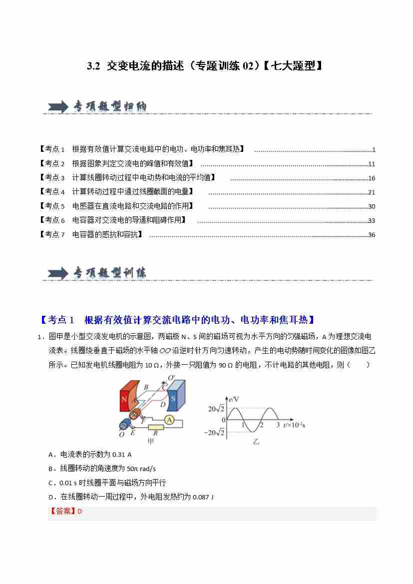 3.2 交变电流的描述(专题训练02)(七大题型)(教师版)