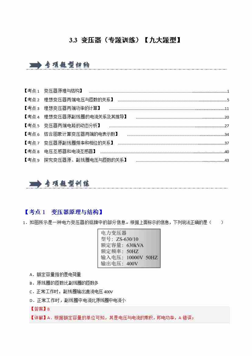 3.3 变压器(专题训练)(九大题型)(教师版)