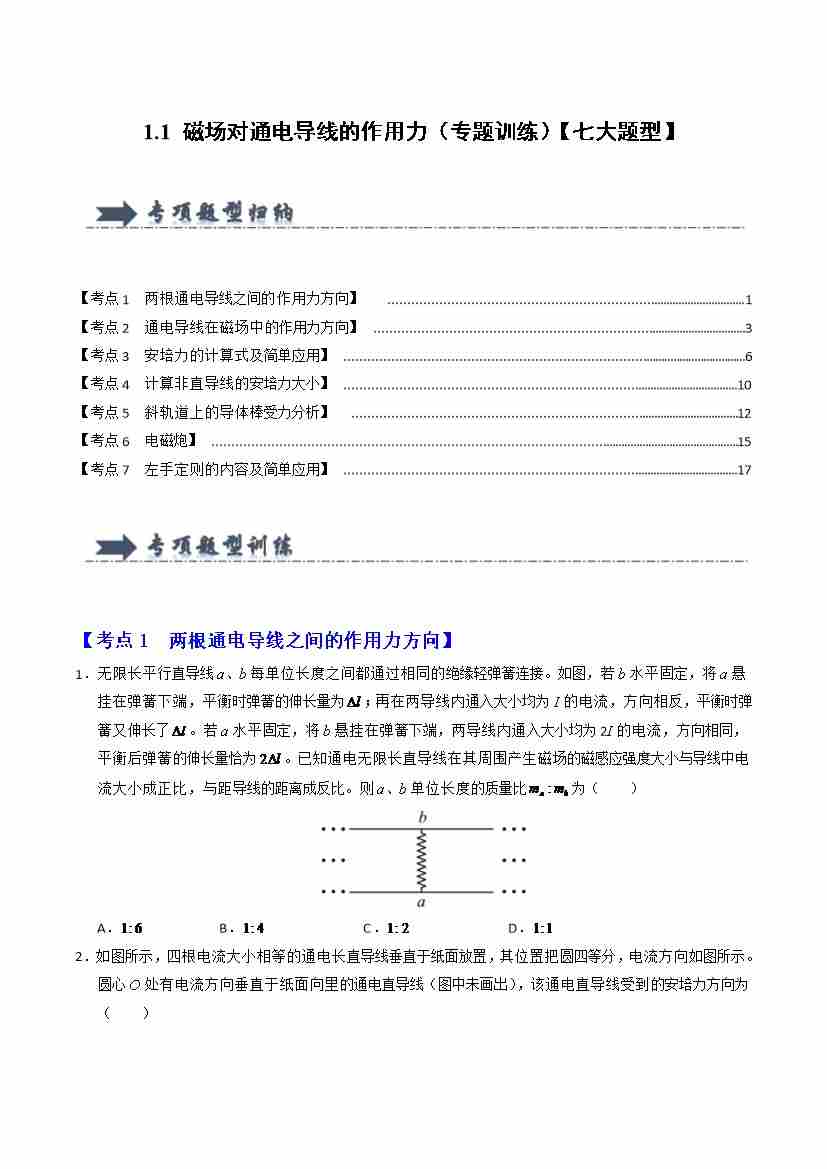 1.1 磁场对通电导线的作用力(专题训练)(七大题型)(学生版)