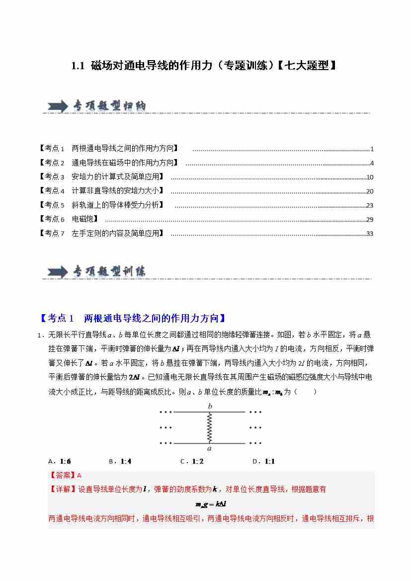 1.1 磁场对通电导线的作用力(专题训练)(七大题型)(教师版)