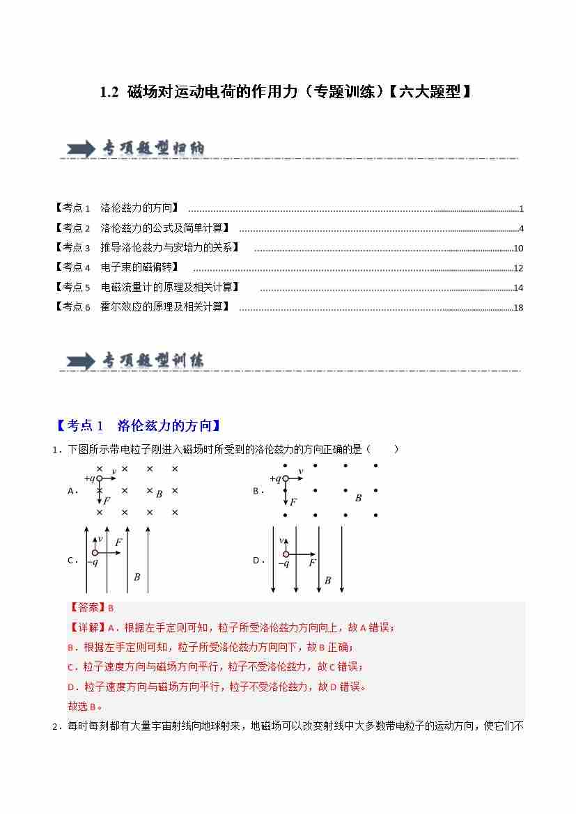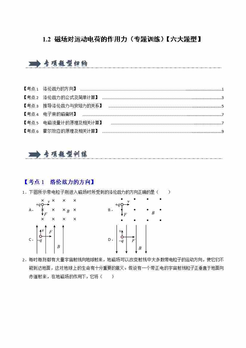 1.2 磁场对运动电荷的作用力(专题训练)(六大题型)(学生版)