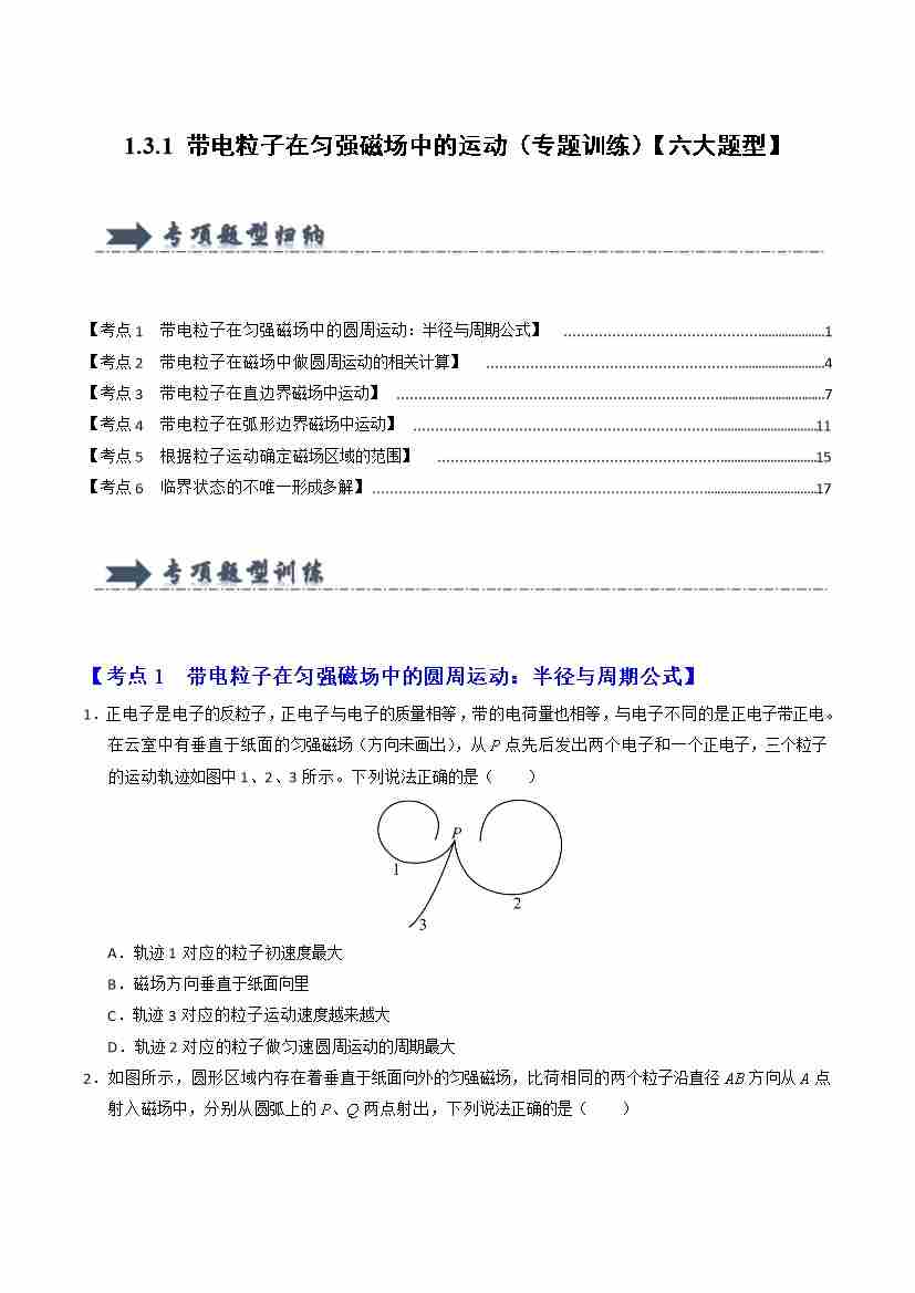 1.3.1 带电粒子在匀强磁场中的运动(专题训练)(六大题型)(学生版)