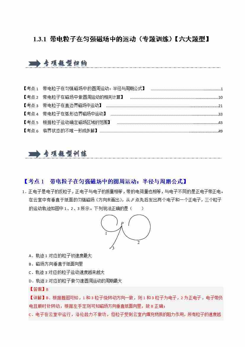 1.3.1 带电粒子在匀强磁场中的运动(专题训练)(六大题型)(教师版)