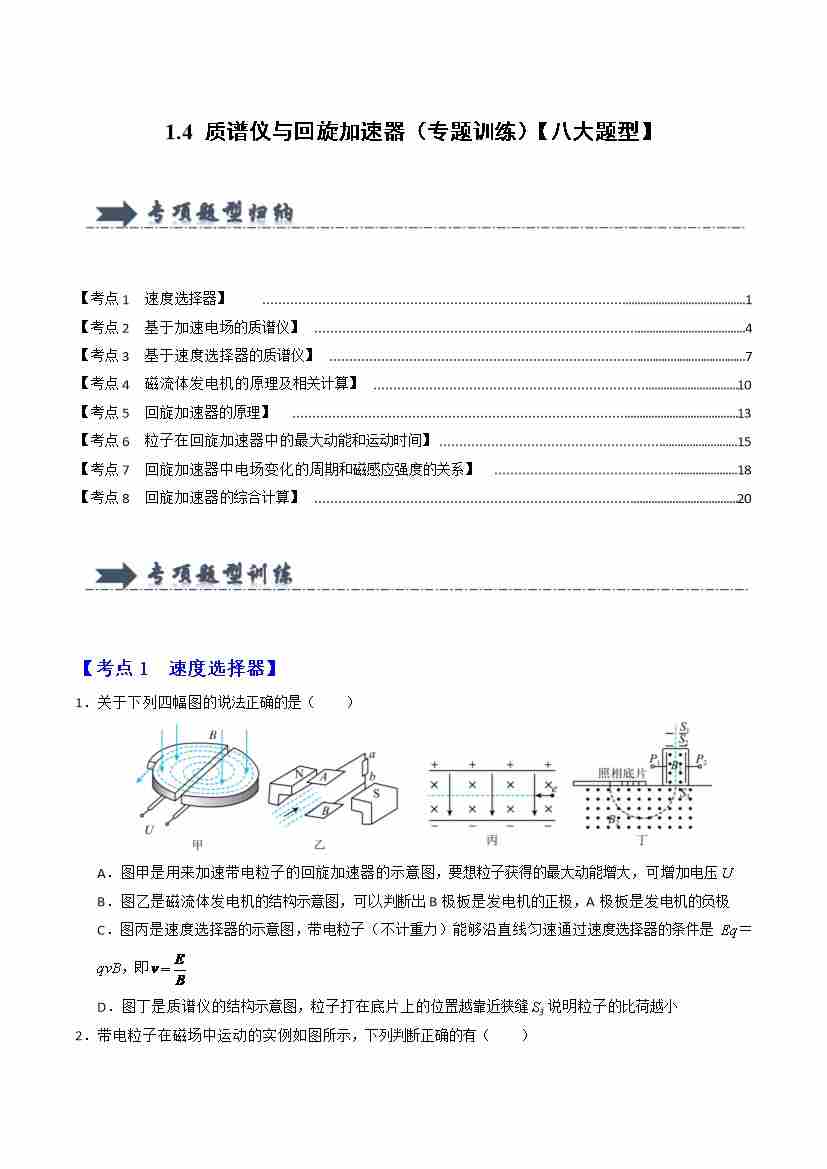 1.4 质谱仪与回旋加速器(专题训练)(八大题型)(学生版)