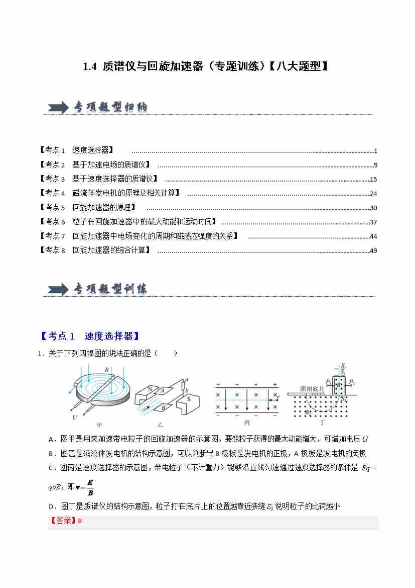 1.4 质谱仪与回旋加速器(专题训练)(八大题型)(教师版)