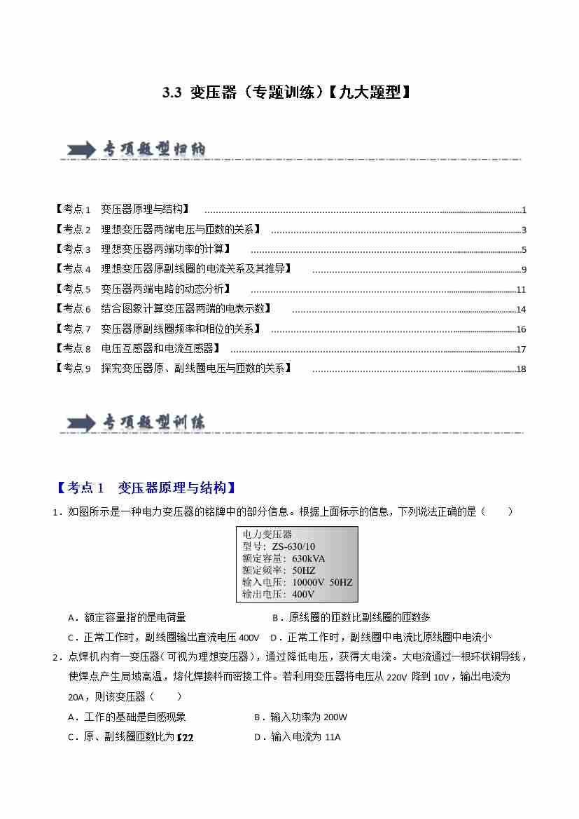 3.3 变压器(专题训练)(九大题型)(学生版)