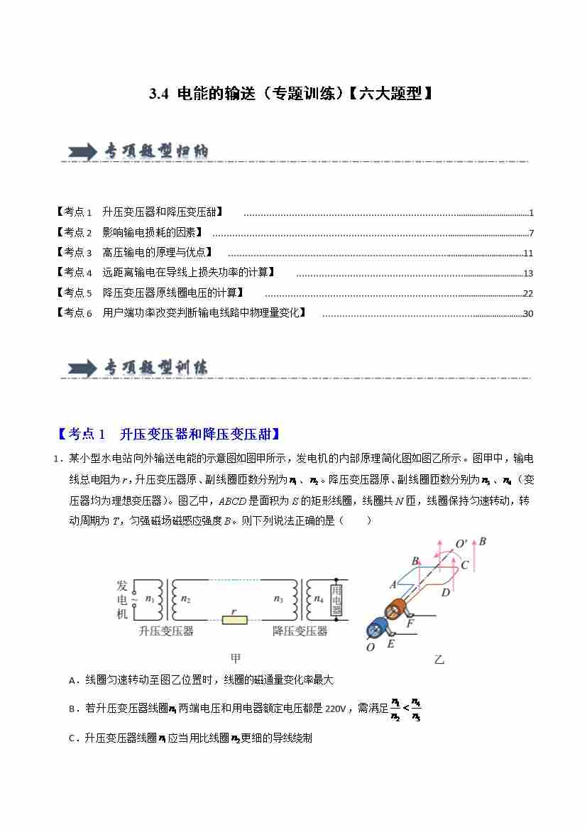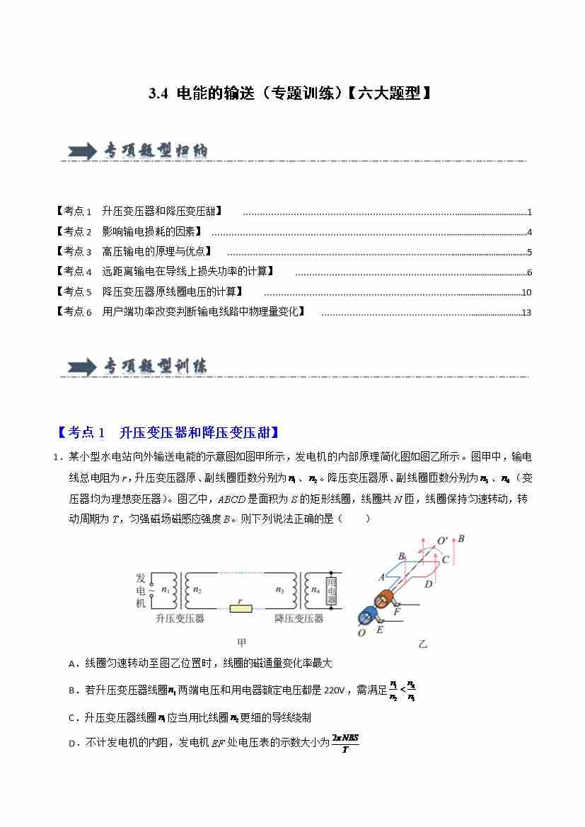 3.4 电能的输送(专题训练)(六大题型)(学生版)