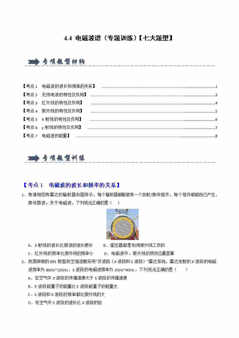 4.4 电磁波谱(专题训练)(七大题型)(学生版)