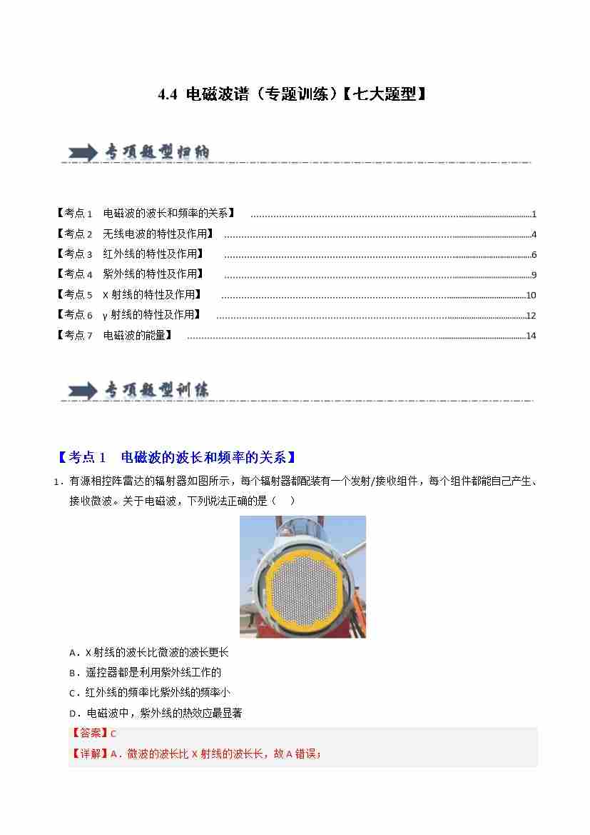 4.4 电磁波谱(专题训练)(七大题型)(教师版)