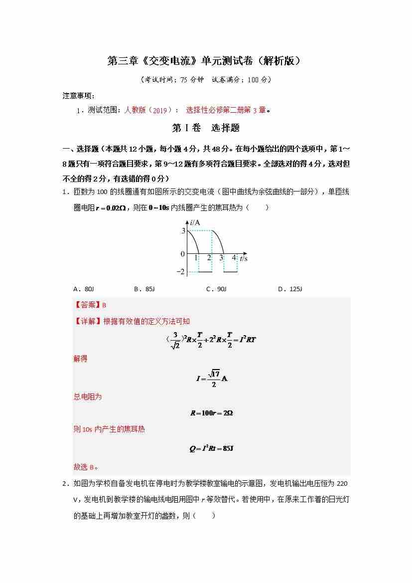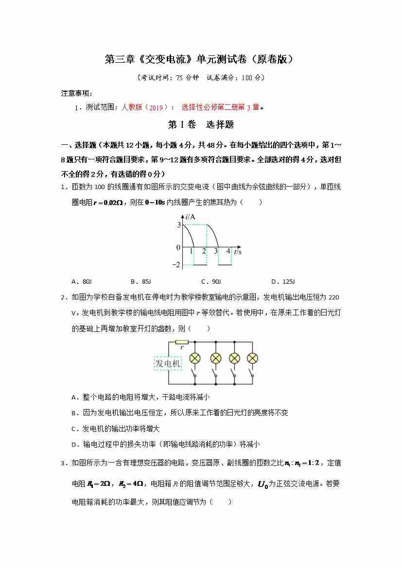 第3章《交变电流》单元测试卷(学生版)