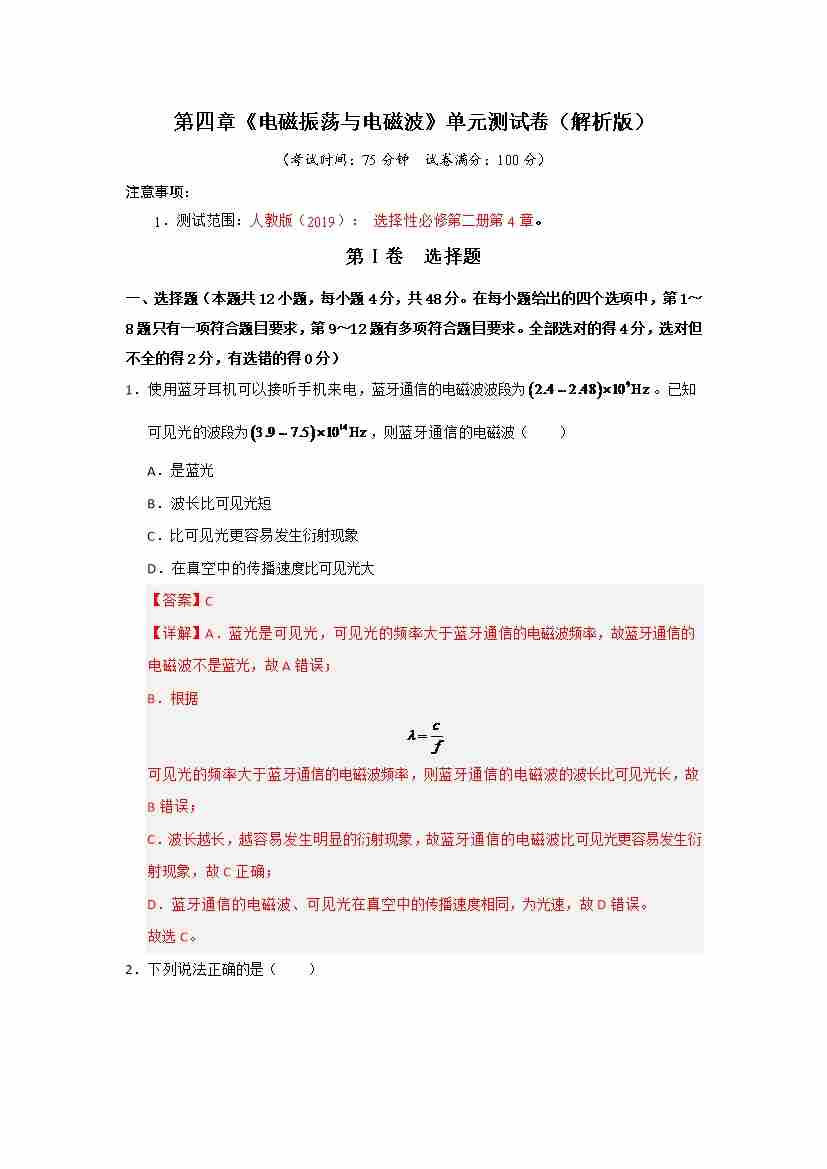 第4章《电磁振荡与电磁波》单元测试卷(教师版)