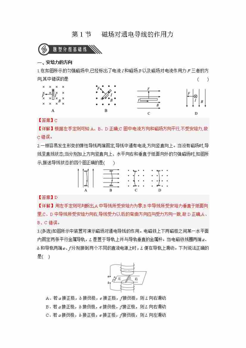 1.1 磁场对通电导线的作用力(分层作业)(解析版)