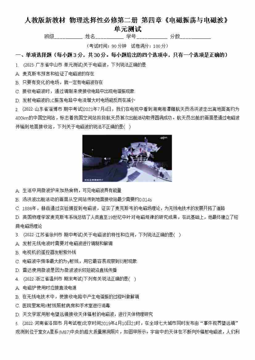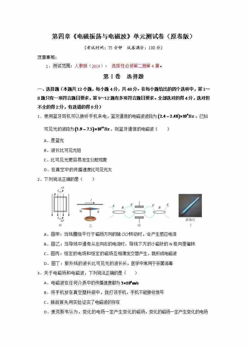 第四章 电磁振荡与电磁波(单元测试)(原卷版)