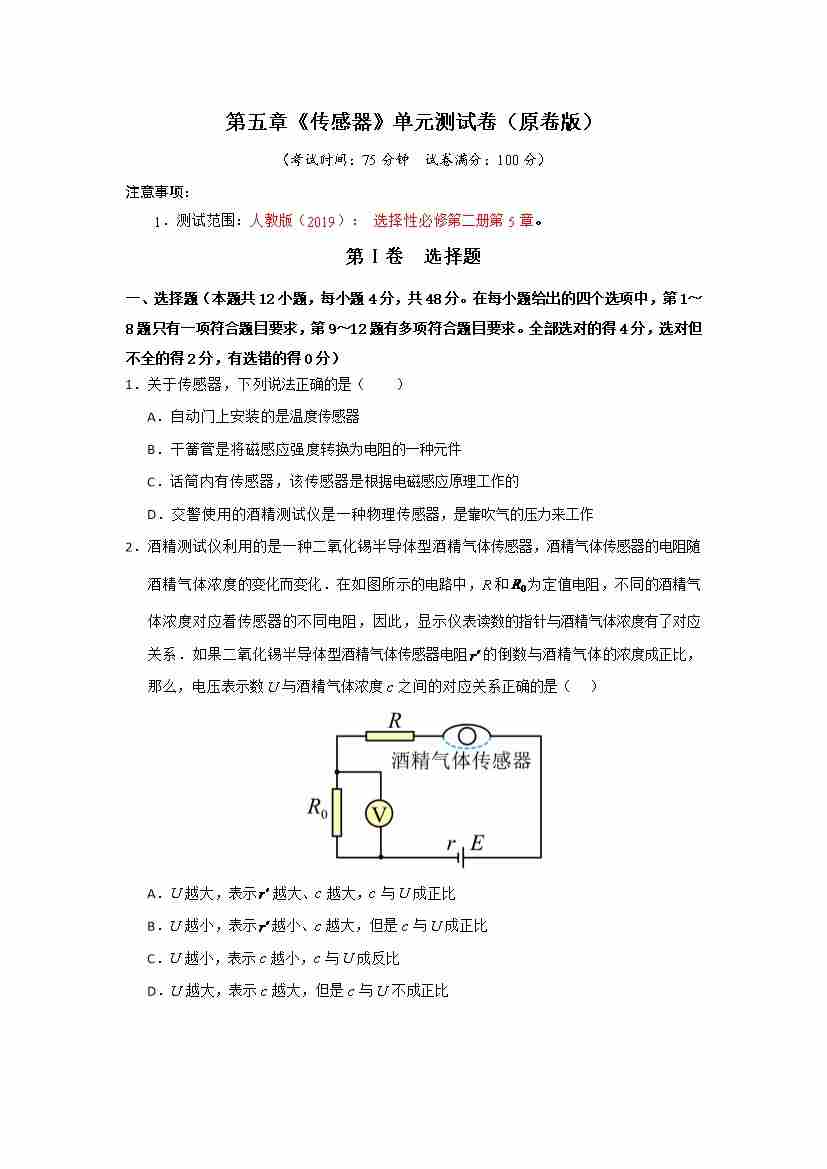 第五章 传感器(单元测试)(原卷版)