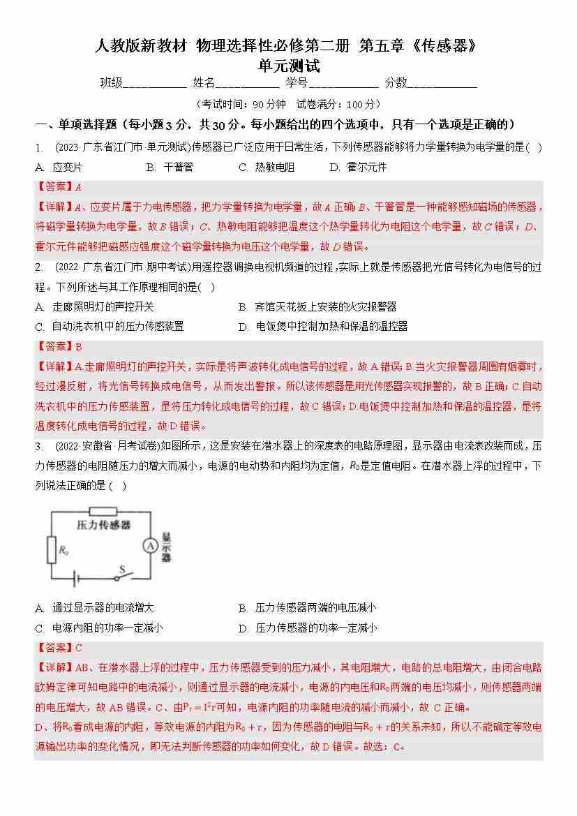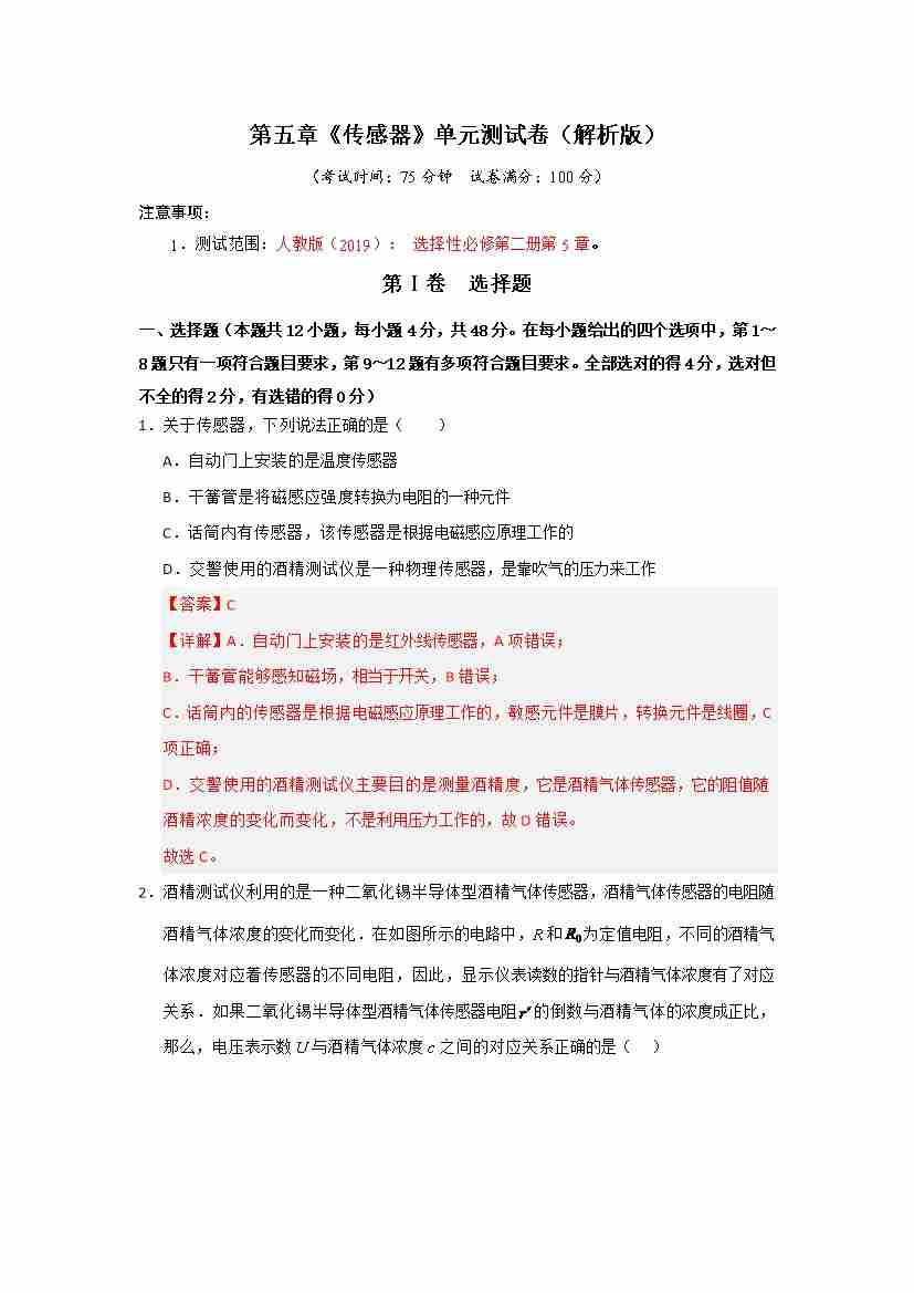 第五章 传感器(单元测试)(解析版)