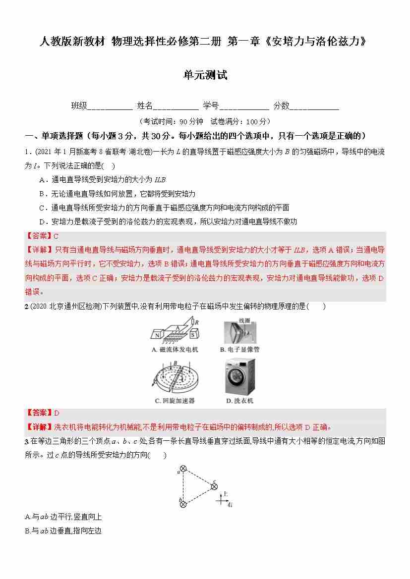 第一章 安培力与洛伦兹力(单元测试)(解析版)