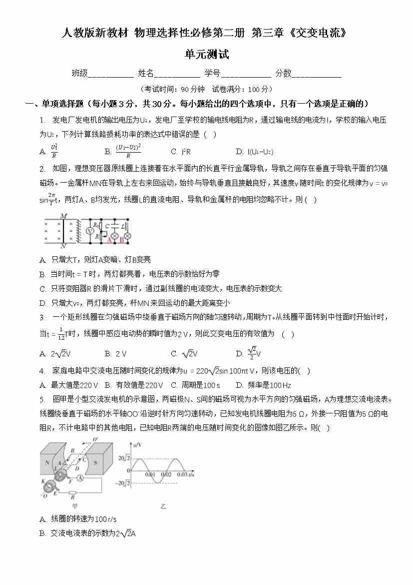 第三章 交变电流(单元测试)(原卷版)