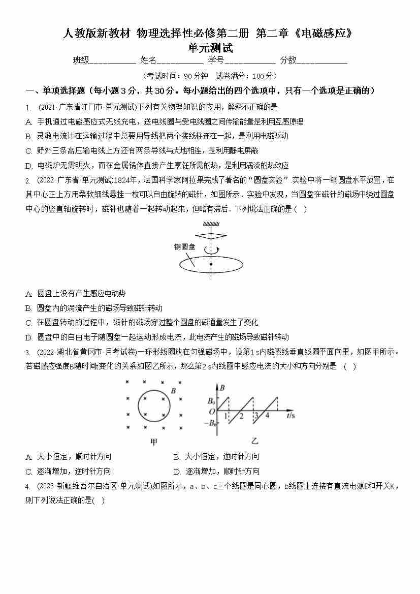 第二章《电磁感应》单元测试(原卷版)-(人教版2019选择性必修第二册)