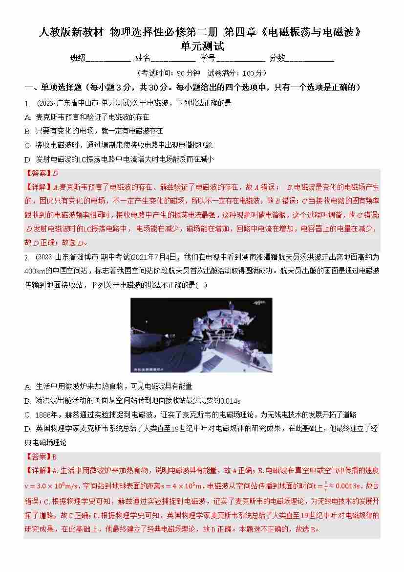 第四章 电磁振荡与电磁波(单元测试)(解析版)