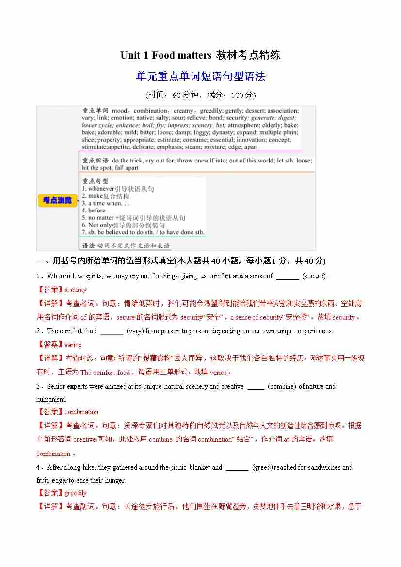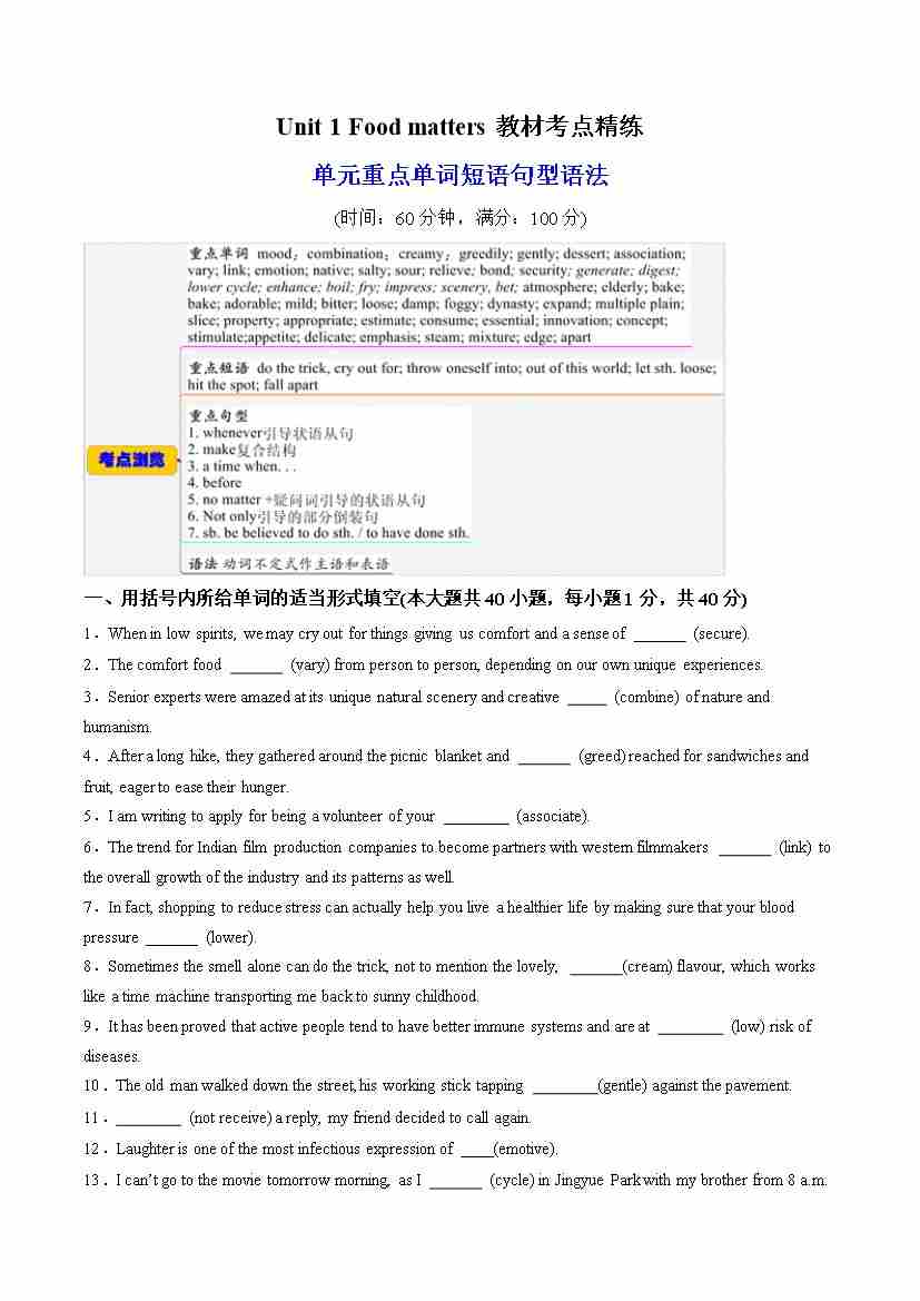 Unit 1 Food matters 单词短语句型语法(教材考点精练)(教师版)