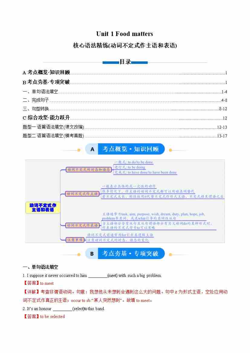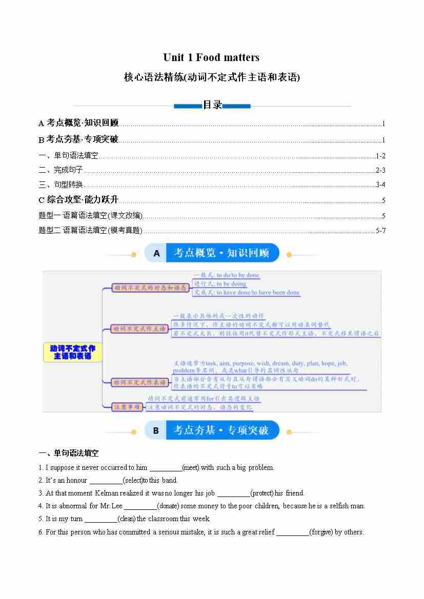 Unit 1 Food mattersl 动词不定式作主语和表语(单元核心语法精练)(教师版)