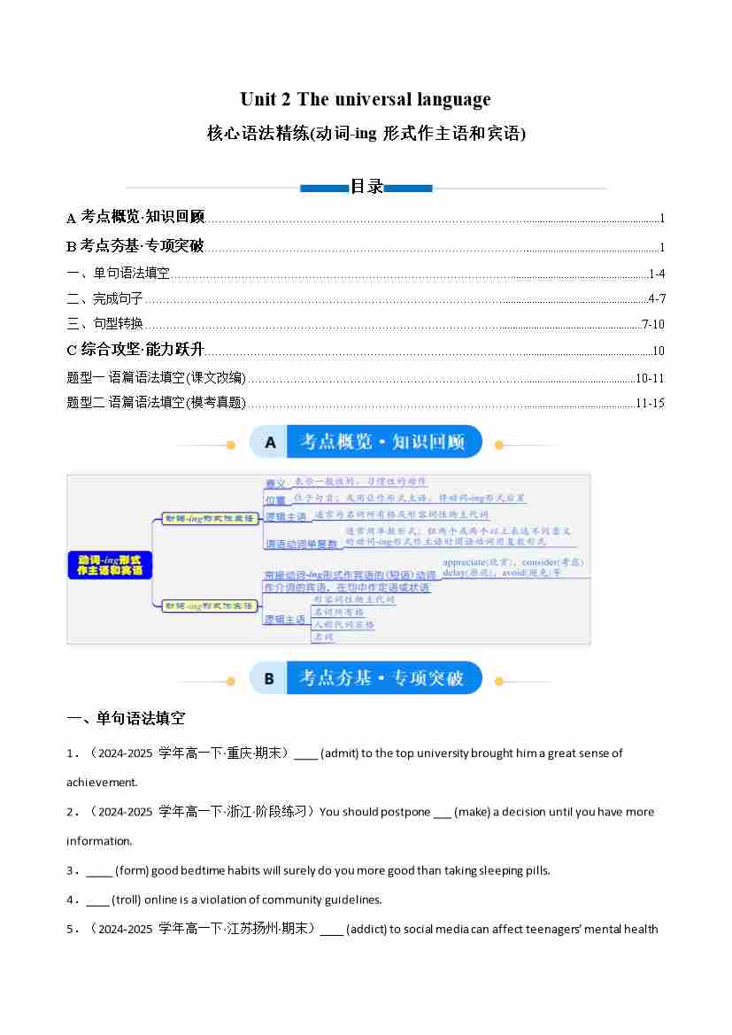 Unit 2 The universal language 动词-ing形式作主语和宾语(单元核心语法精练)(学生版)