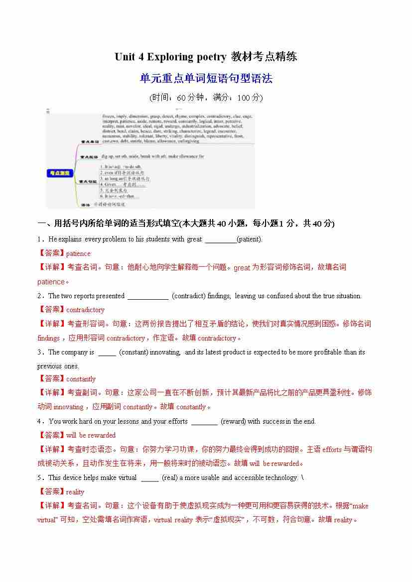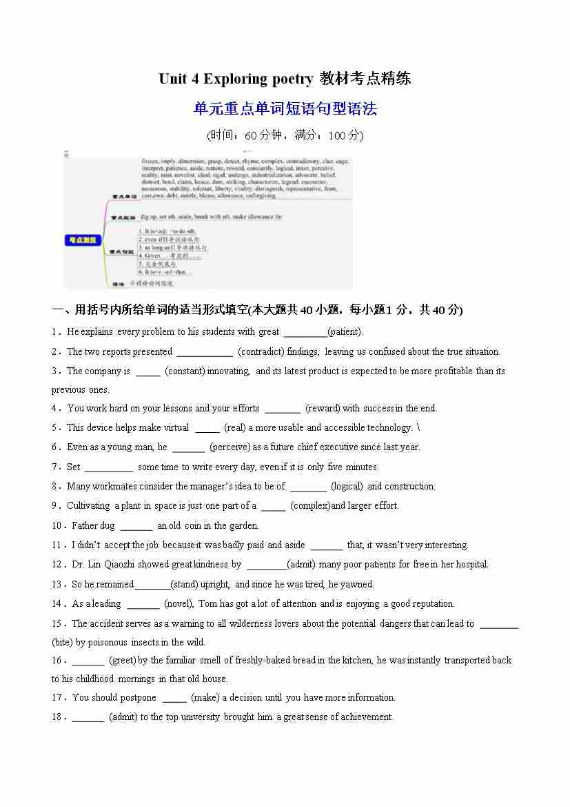 Unit 4 Exploring poetry l 单词短语句型语法(教材考点精练)(教师版)