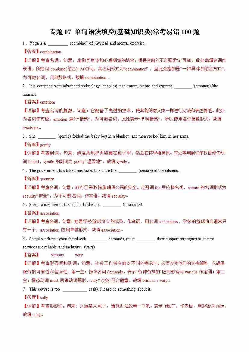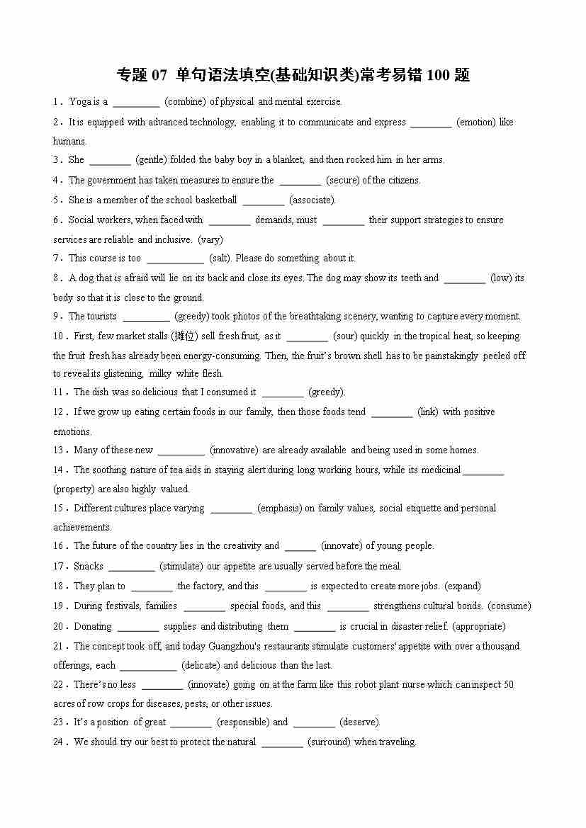 考前押题07 单句语法填空(基础知识类)常考易错100题(期末复习专项训练)(解析版