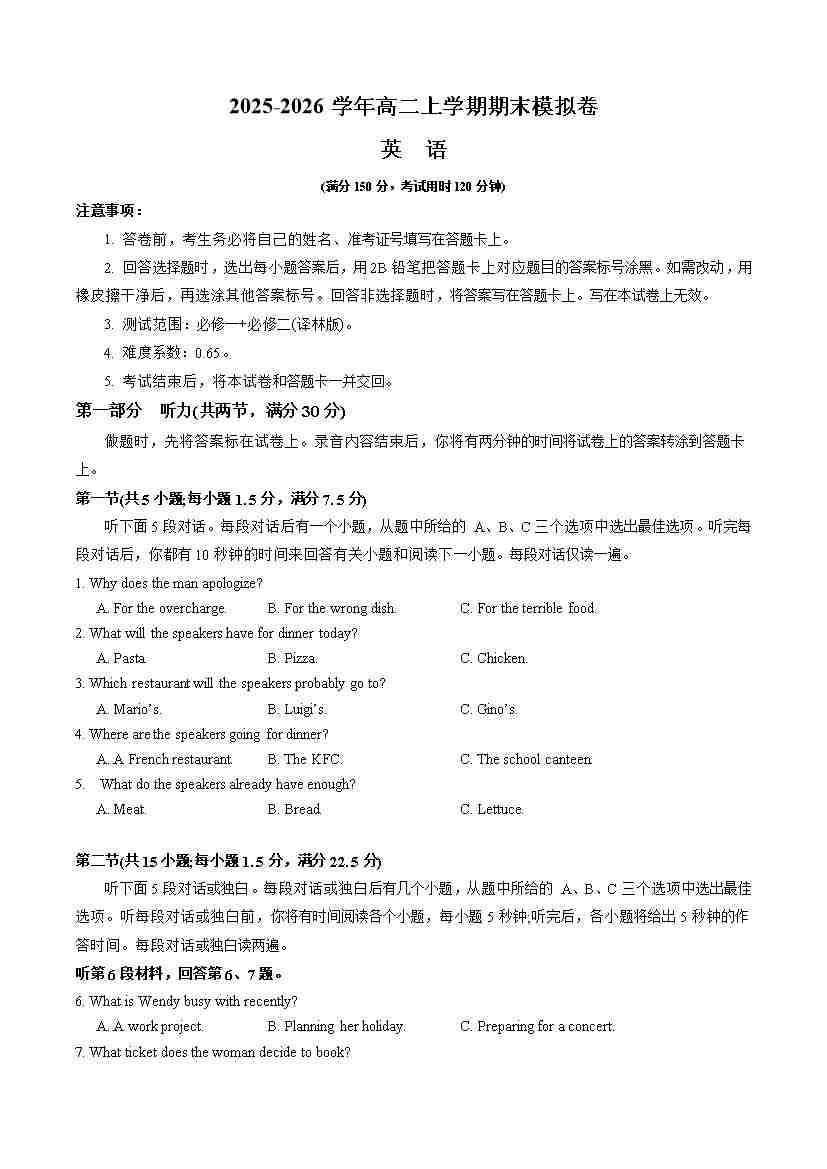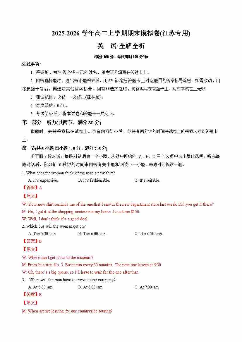 高二英语上学期期末模拟卷(江苏专用)(解析版)