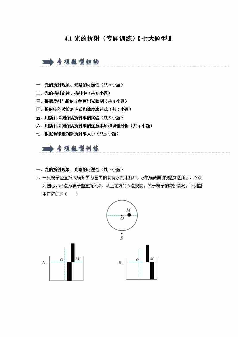 4.1光的折射(专题训练)(七大题型)(学生版)