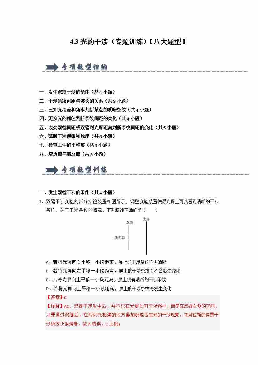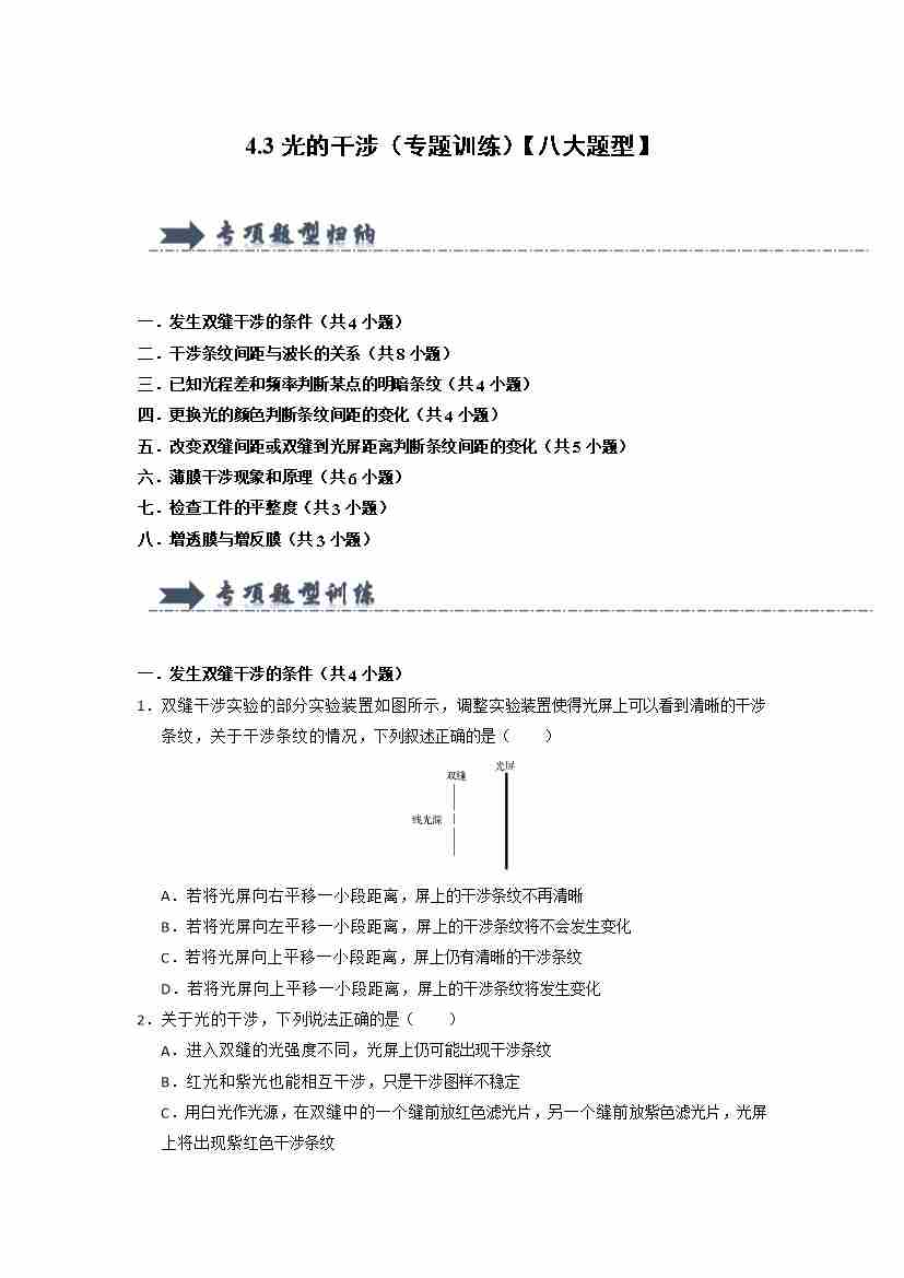 4.3光的干涉(专题训练)(八大题型)(学生版)