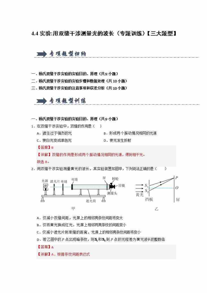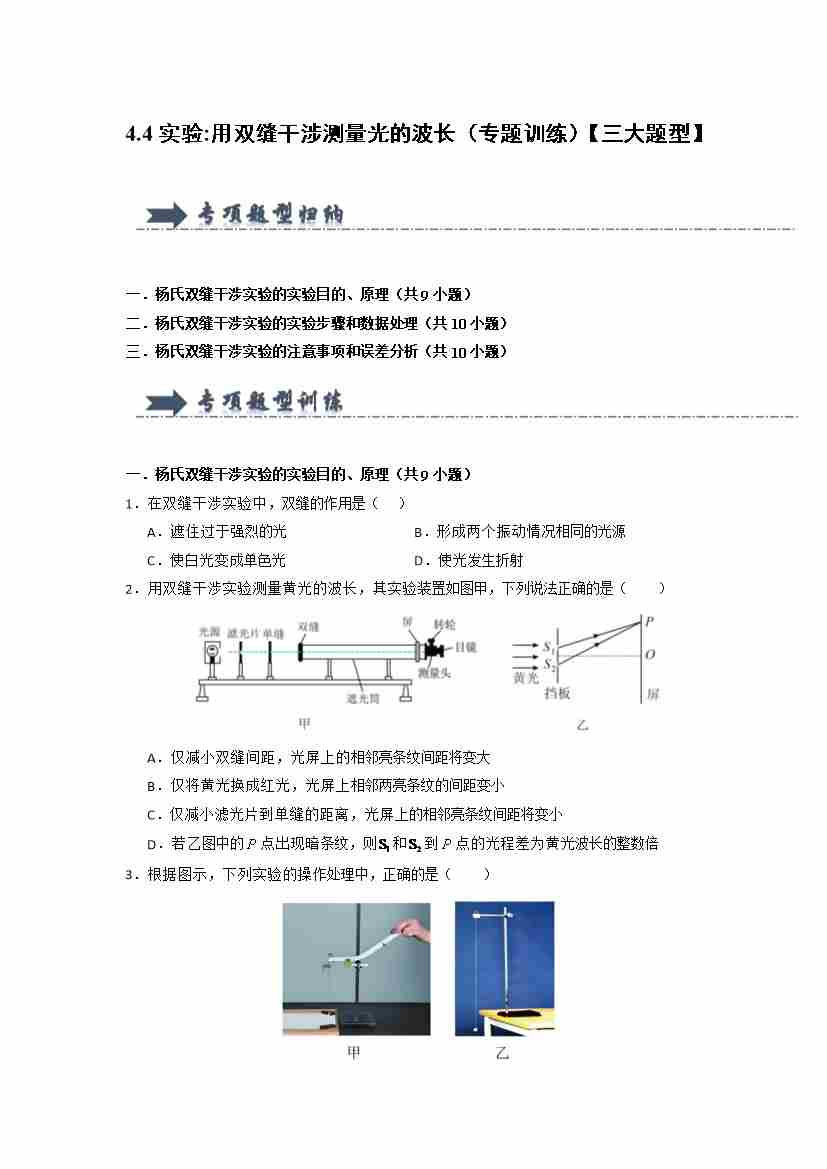 4.4实验:用双缝干涉测量光的波长(专题训练)(三大题型)(学生版)