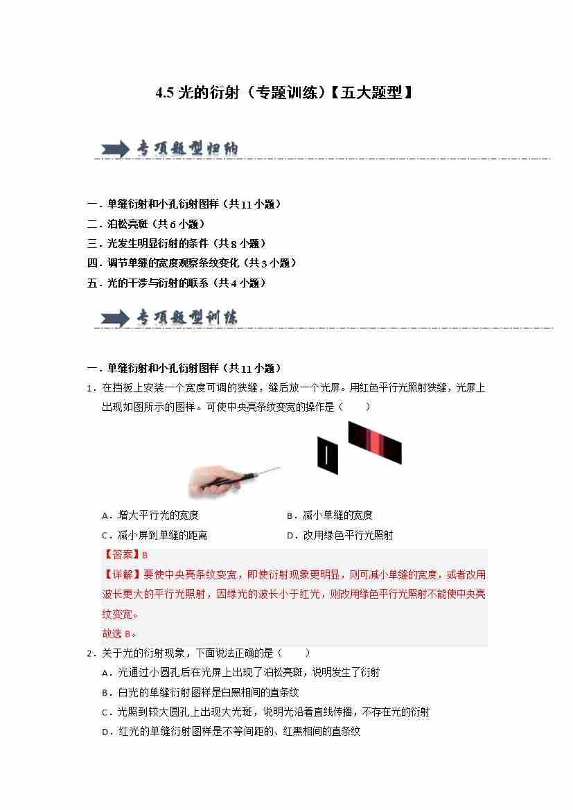 4.5光的衍射(专题训练)(五大题型)(教师版)