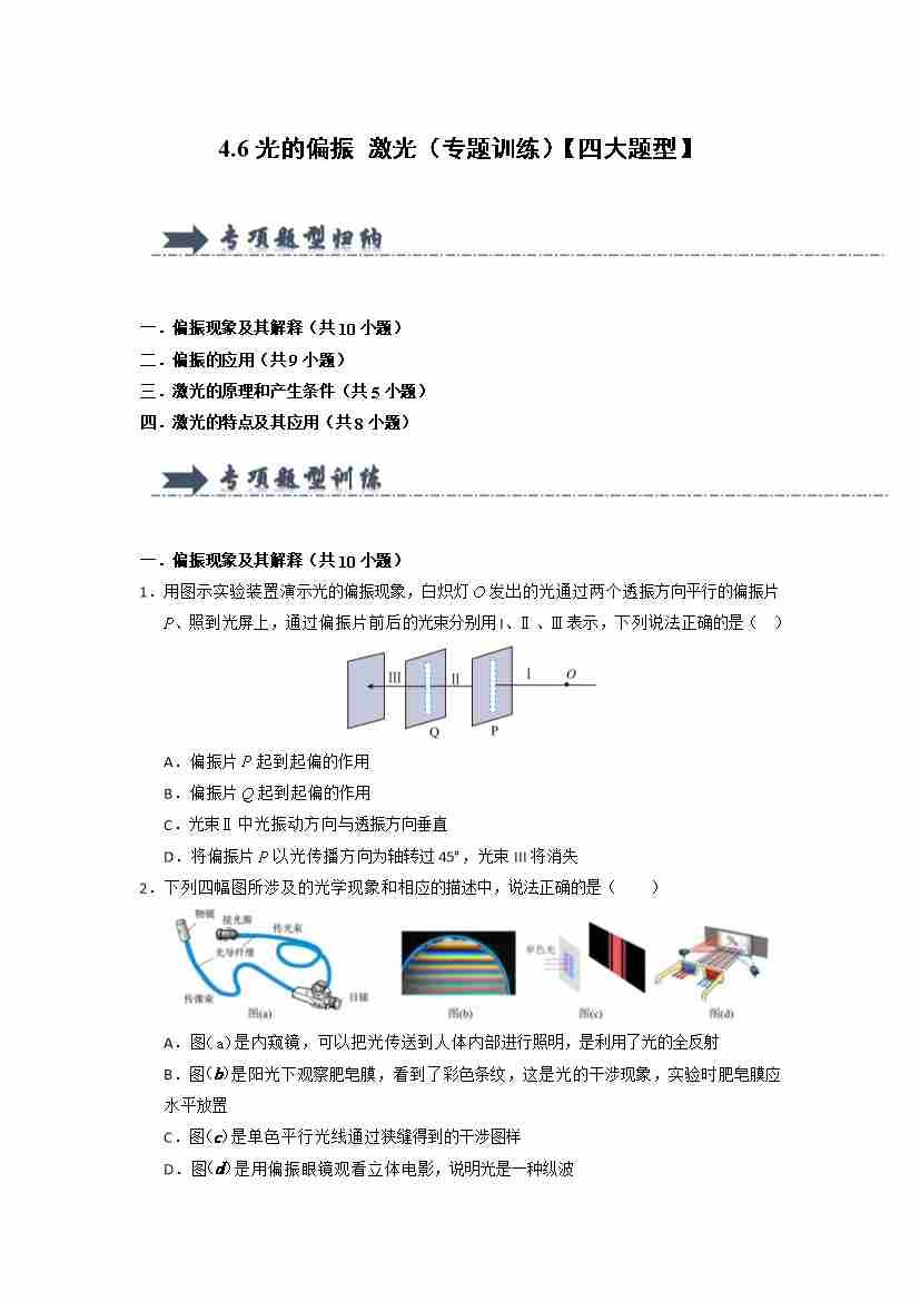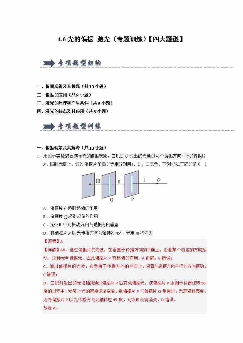 4.6光的偏振 激光(专题训练)(四大题型)(教师版)