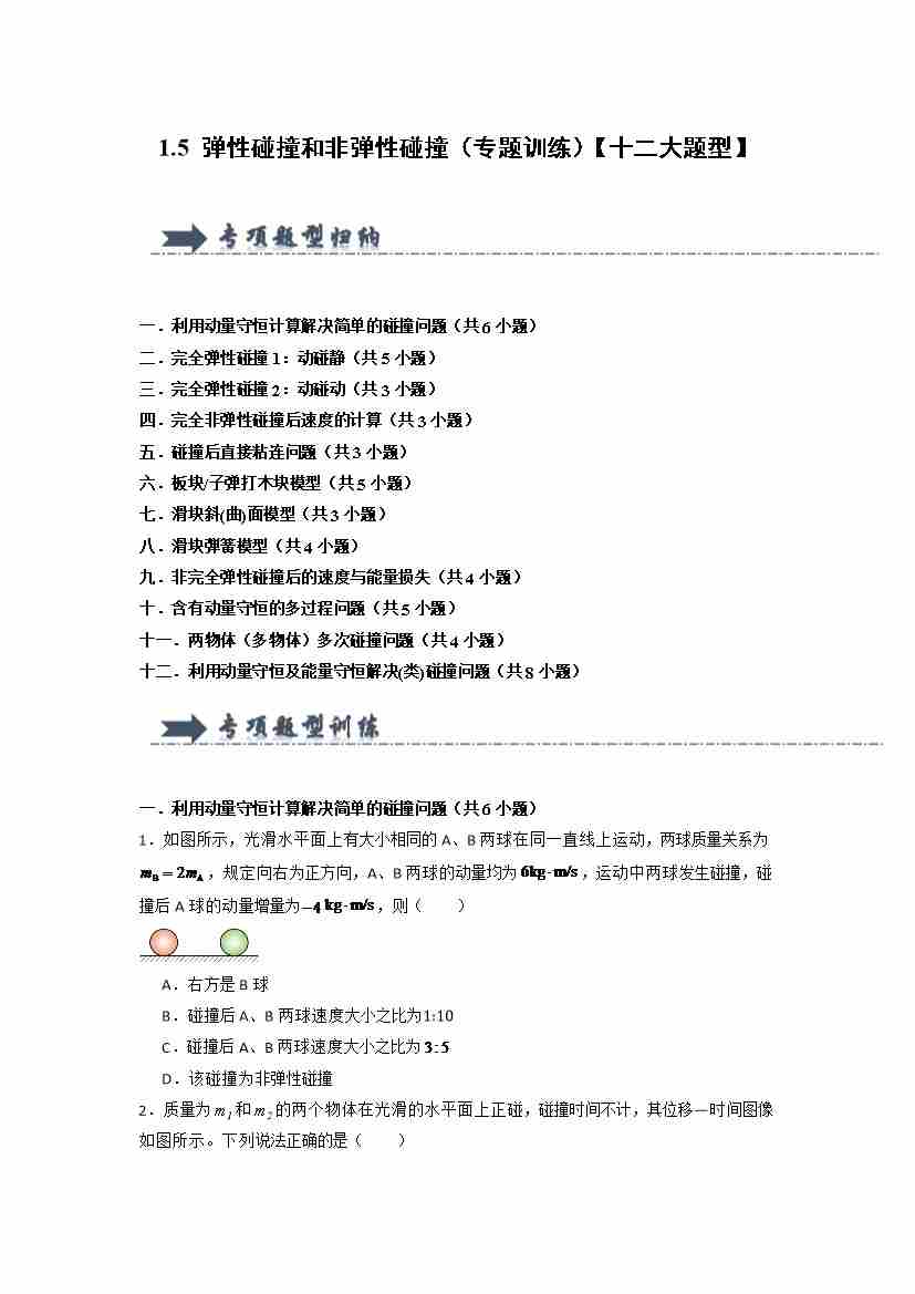 1.5 弹性碰撞和非弹性碰撞(专题训练)(十二大题型)(学生版)