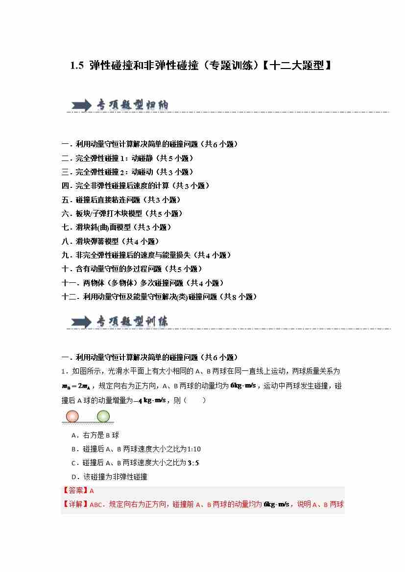 1.5 弹性碰撞和非弹性碰撞(专题训练)(十二大题型)(教师版)