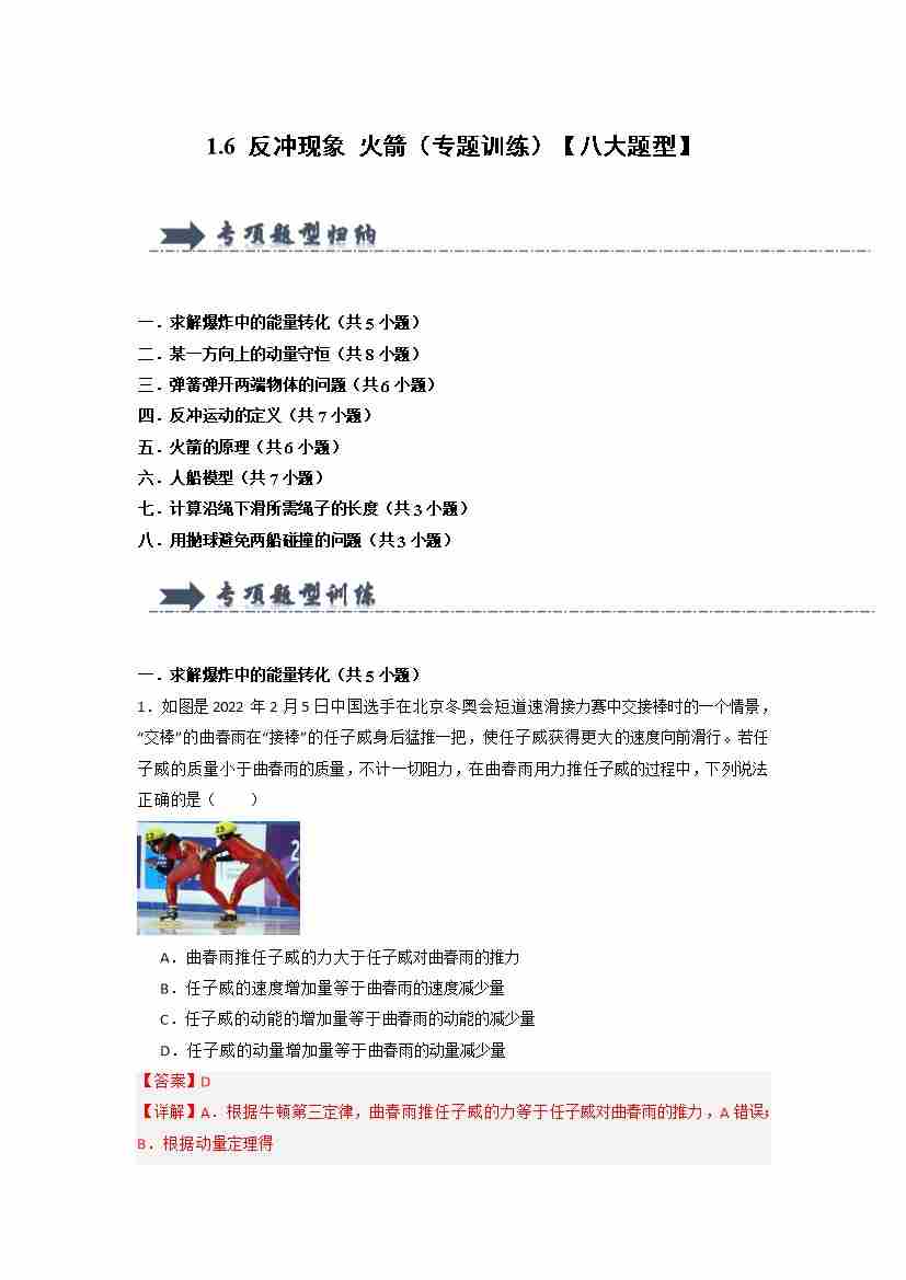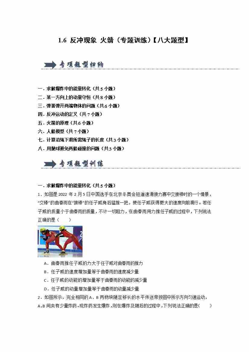 1.6 反冲现象 火箭(专题训练)(八大题型)(学生版)