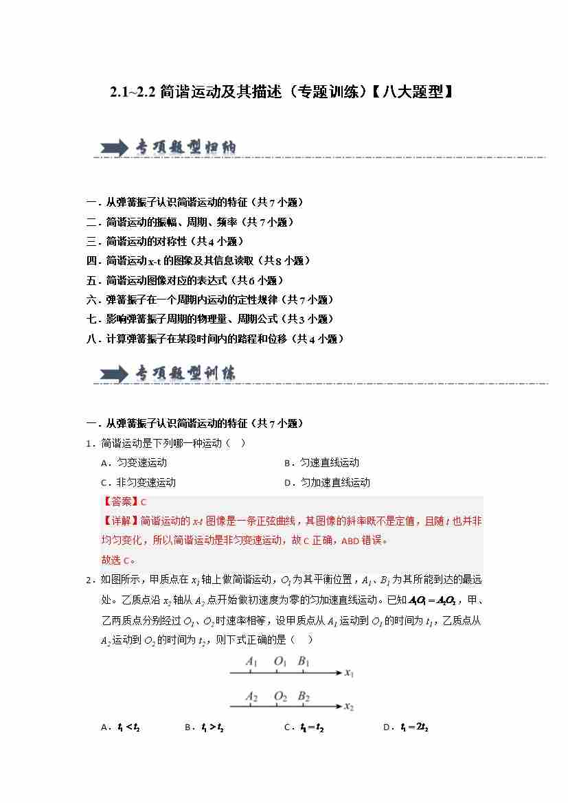 2.1~2.2简谐运动及其描述(专题训练)(八大题型) (教师版)