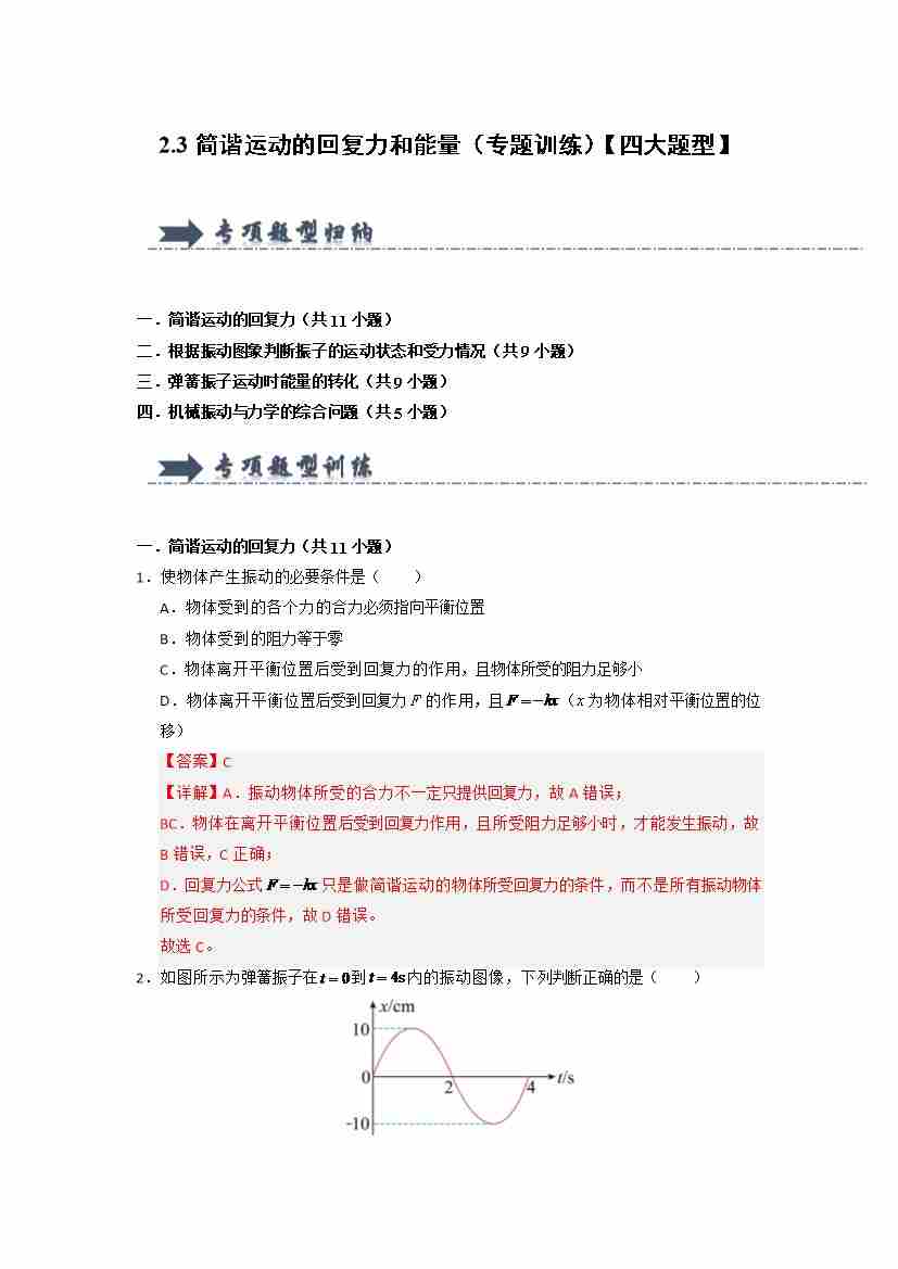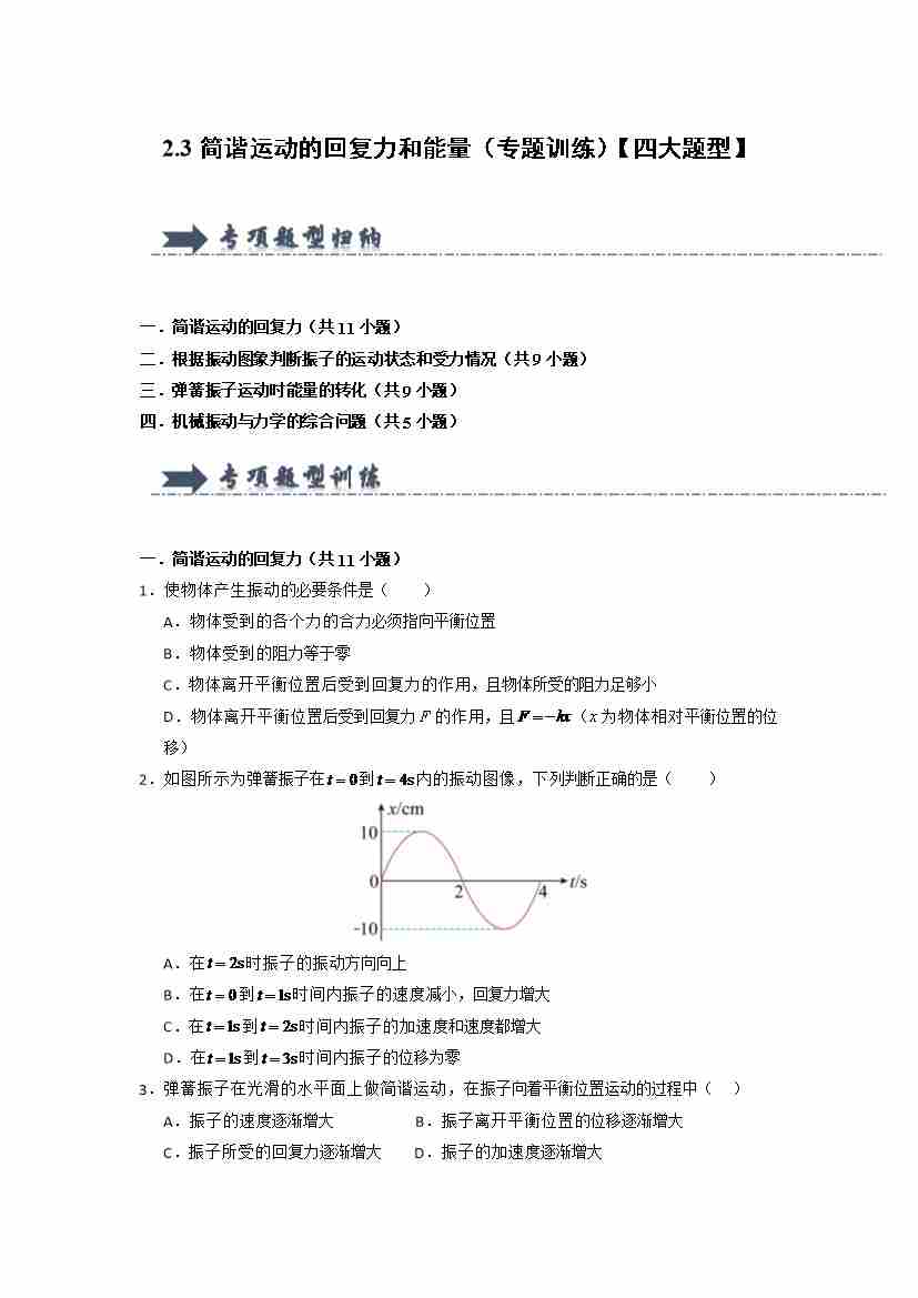 2.3简谐运动的回复力和能量(专题训练)(四大题型) (学生版)