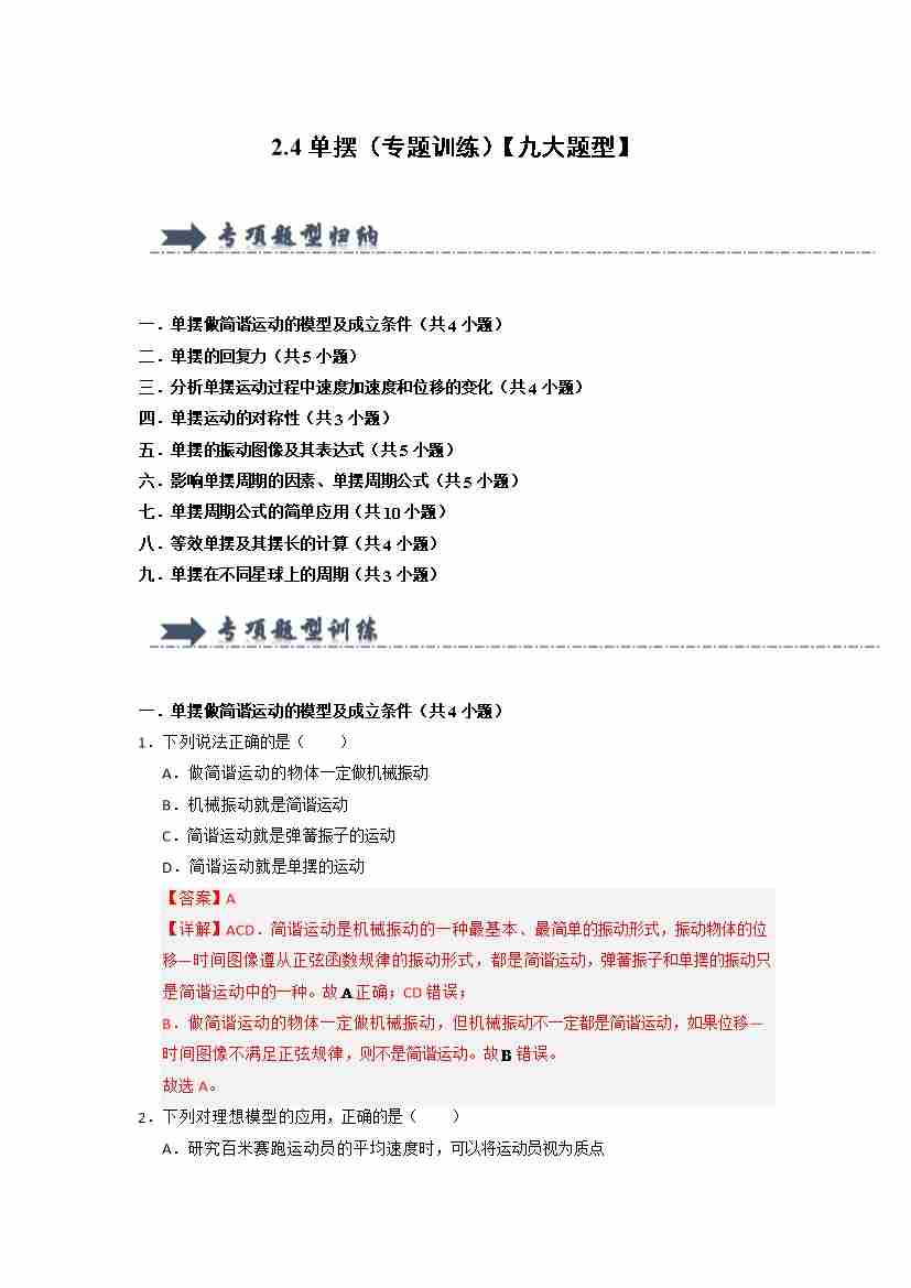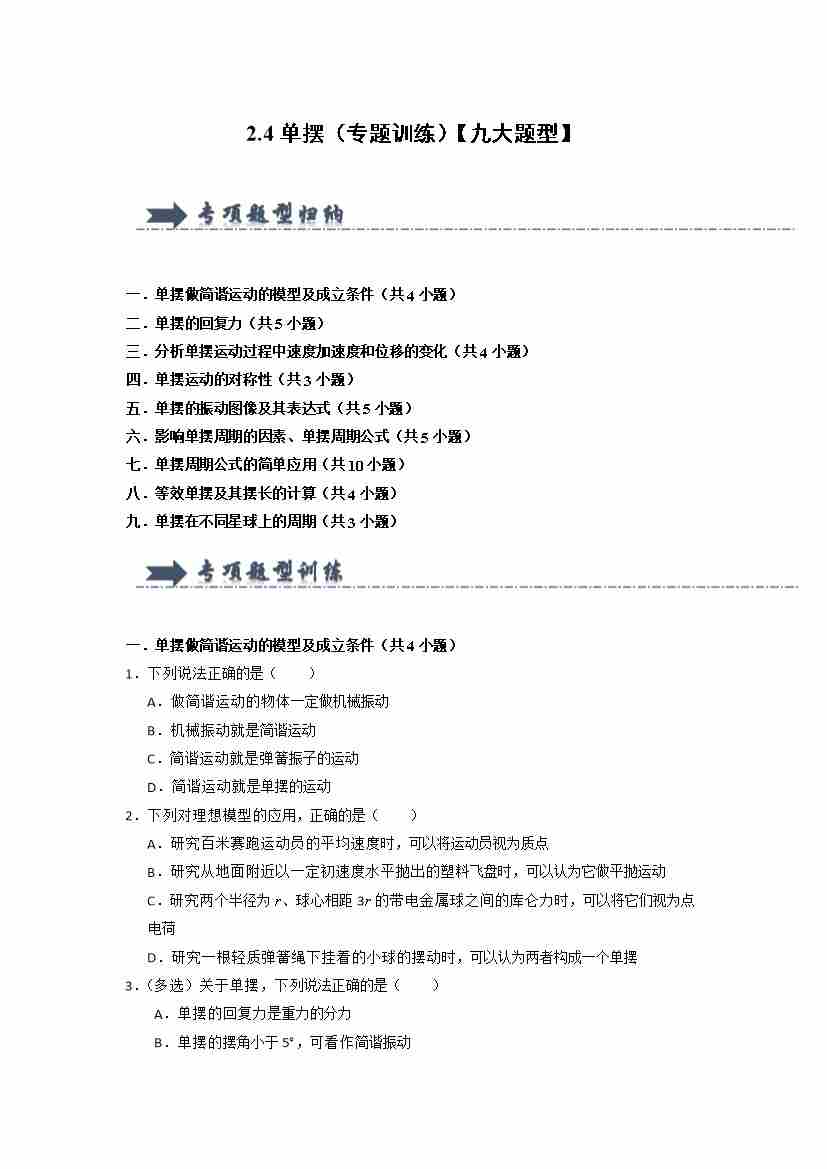 2.4单摆(专题训练)(九大题型)(学生版)