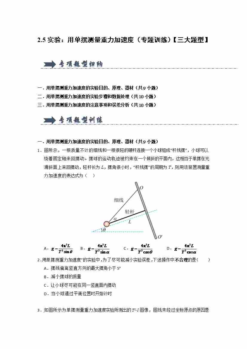 2.5实验:用单摆测量重力加速度(专题训练)(三大题型)(学生版)