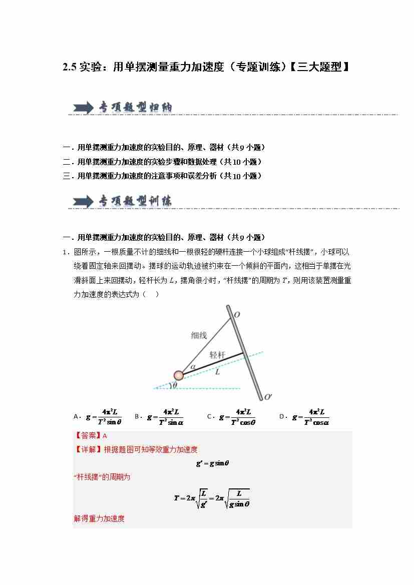 2.5实验:用单摆测量重力加速度(专题训练)(三大题型)(教师版)