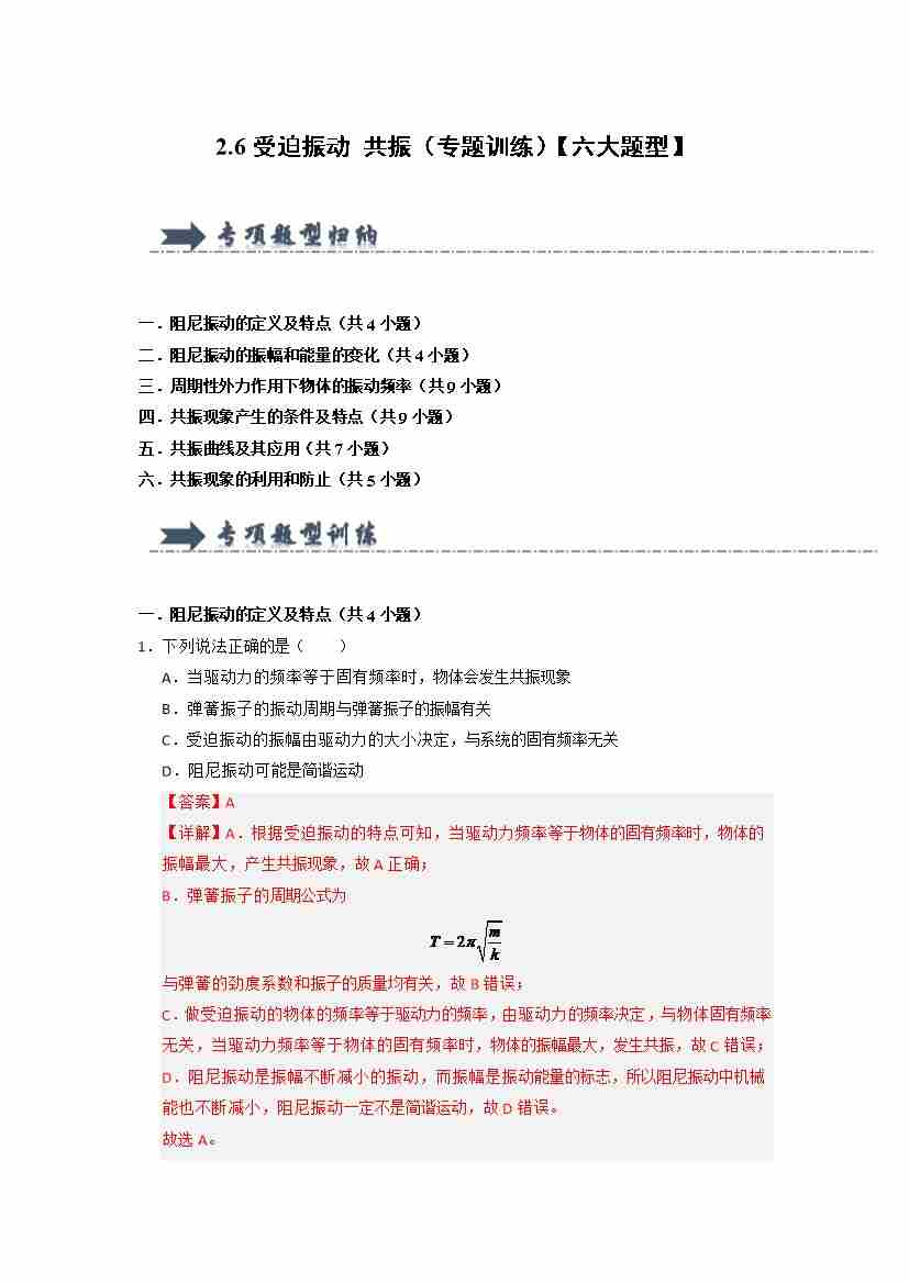 2.6受迫振动 共振(专题训练)(六大题型) (教师版)