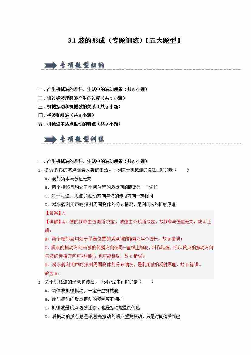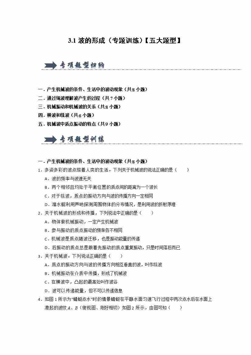 3.1波的形成(专题训练)(五大题型)(教师版)