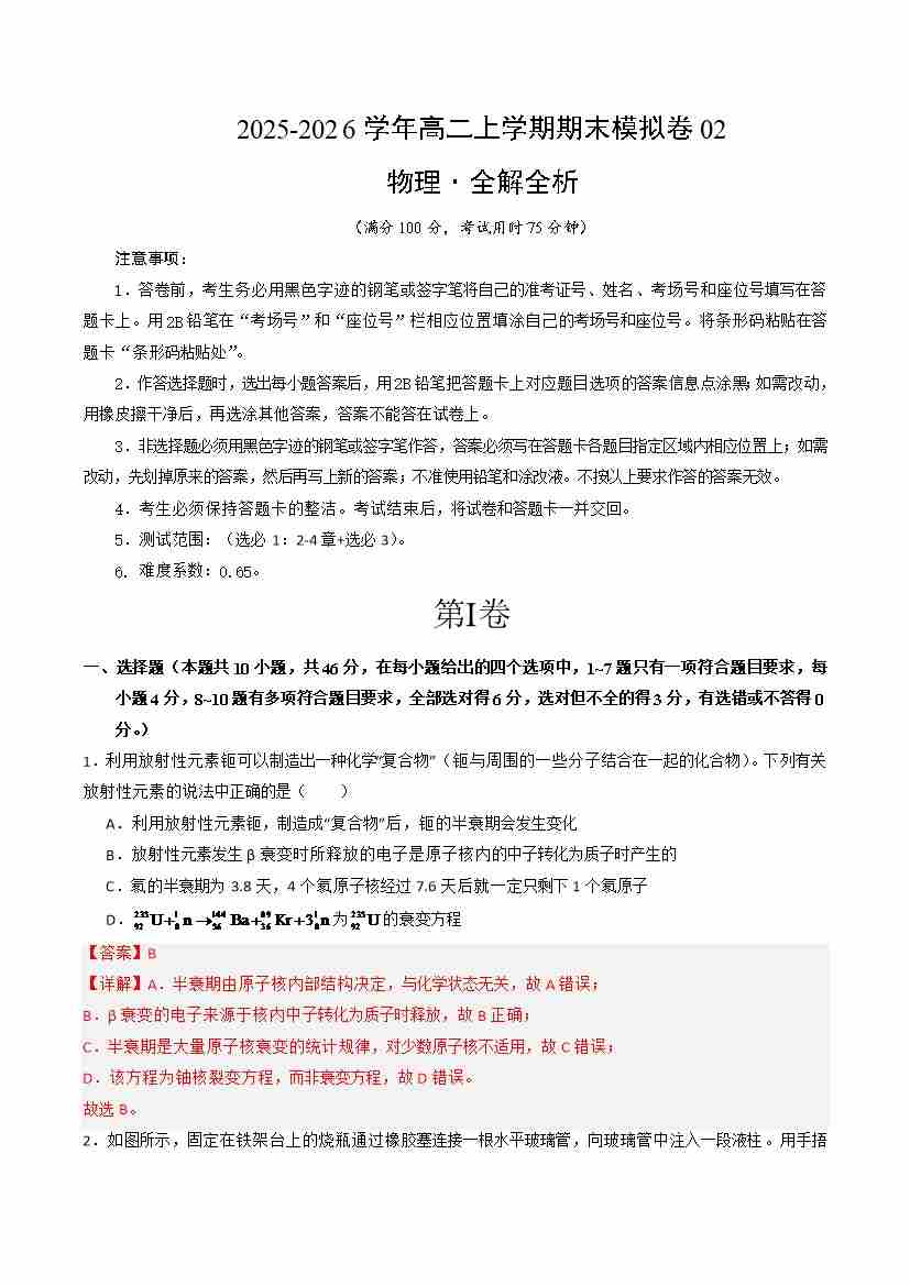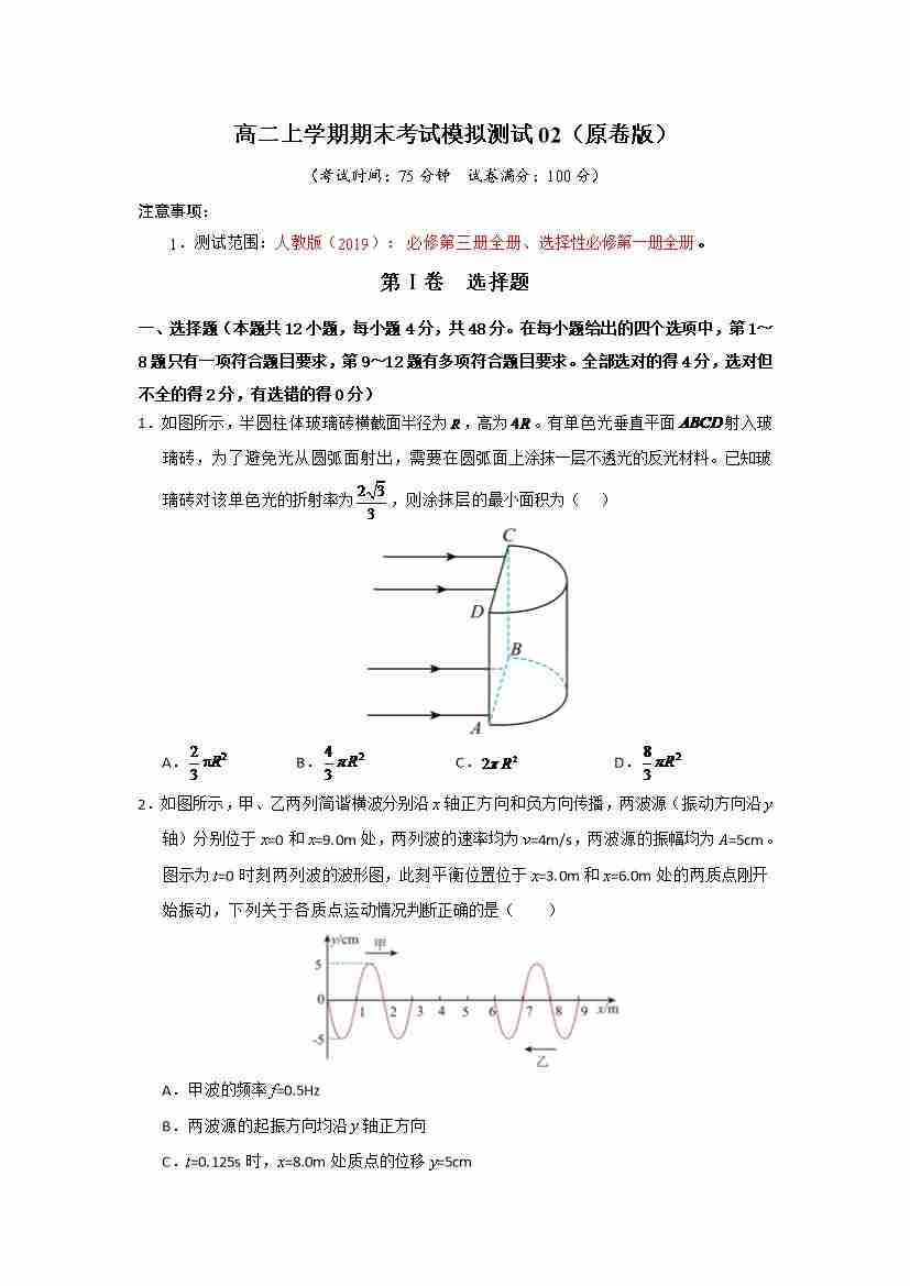 高二物理上学期期末模拟卷02(人教版2019)(全解全析)