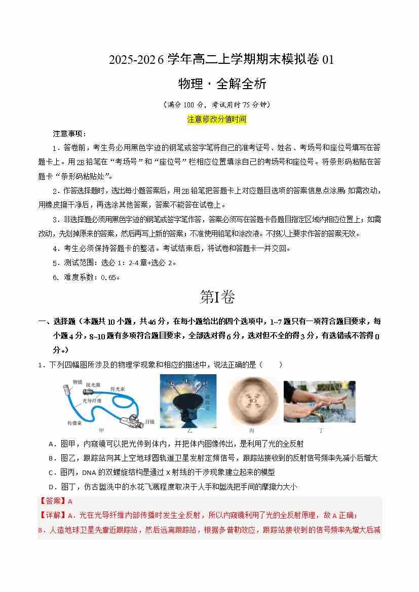 高二物理上学期期末模拟卷01(人教版2019)(全解全析)